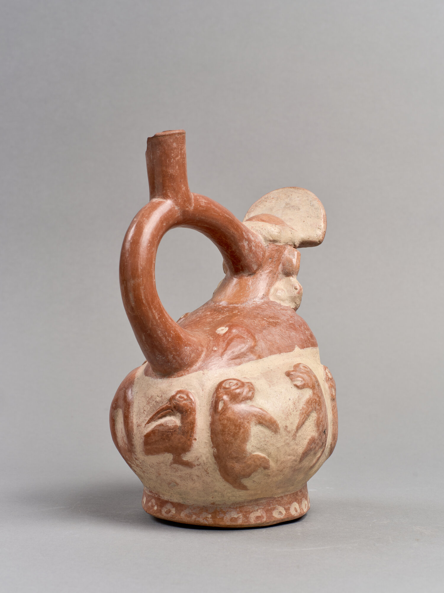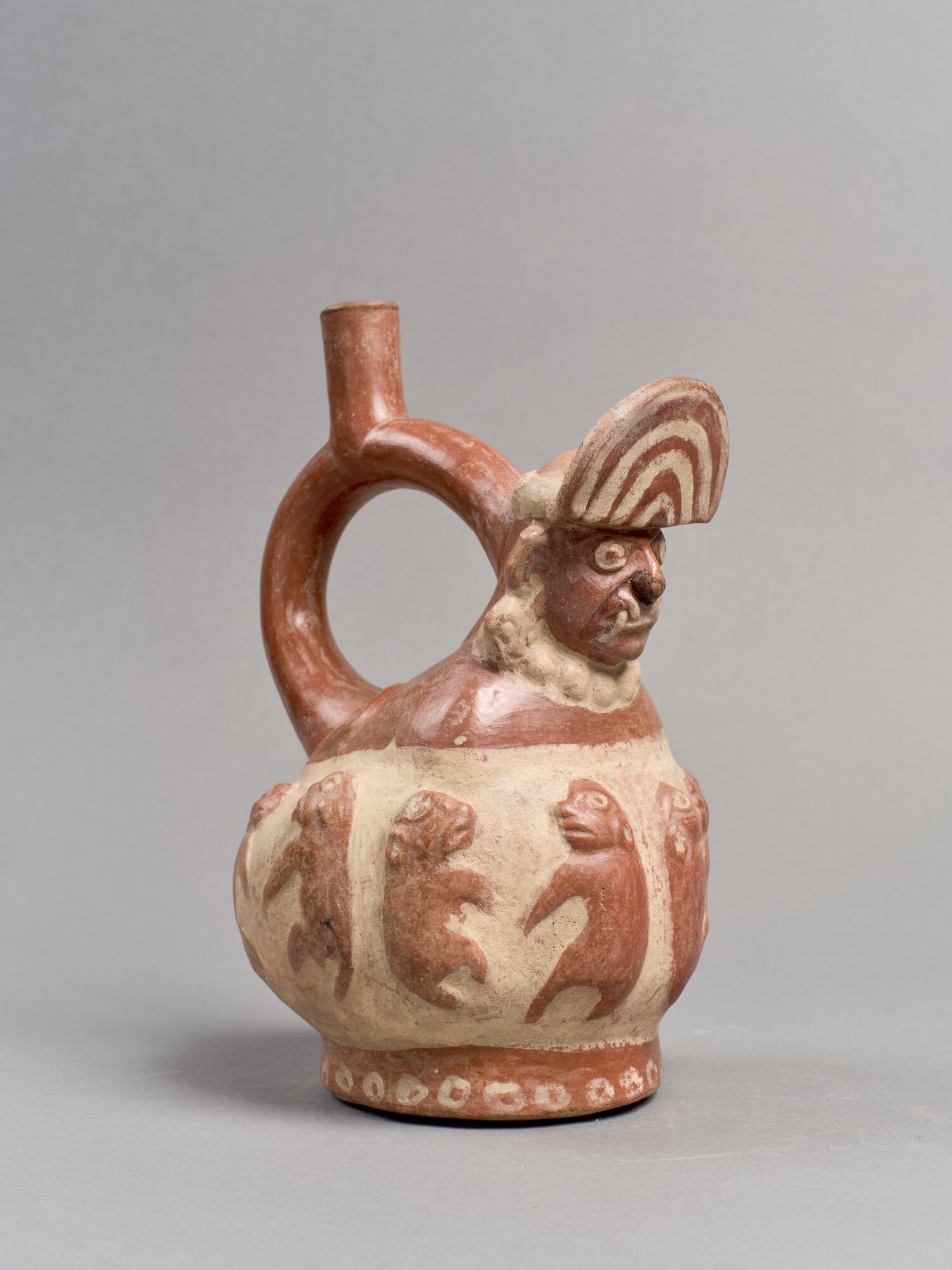 Reperto di colore crema e rosso aranciato. Il piede del vaso, a forma di disco, è distinto e decorato con cerchi concentrici dipinti in crema, mentre il fondo è piatto. La camera pseudo globulare è decorata a rilievo con un felino e sei cuccioli in arancio su fondo crema. Su entrambi i lati della spalla è rappresentato, in rilievo tono su tono e in due diverse posizioni, un uccello dal lungo becco. L'ansa a staffa posteriore termina in una testa antropomorfa identificabile con il demone Ai-Pec o con un "burial theme". La testa è lavorata a tutto tondo ed è arricchita da gorgiera, pendenti auricolari e copricapo semilunato decorati in color crema. Il volto presenta pitture facciali arancio scuro e zanne e occhi spalancati color crema