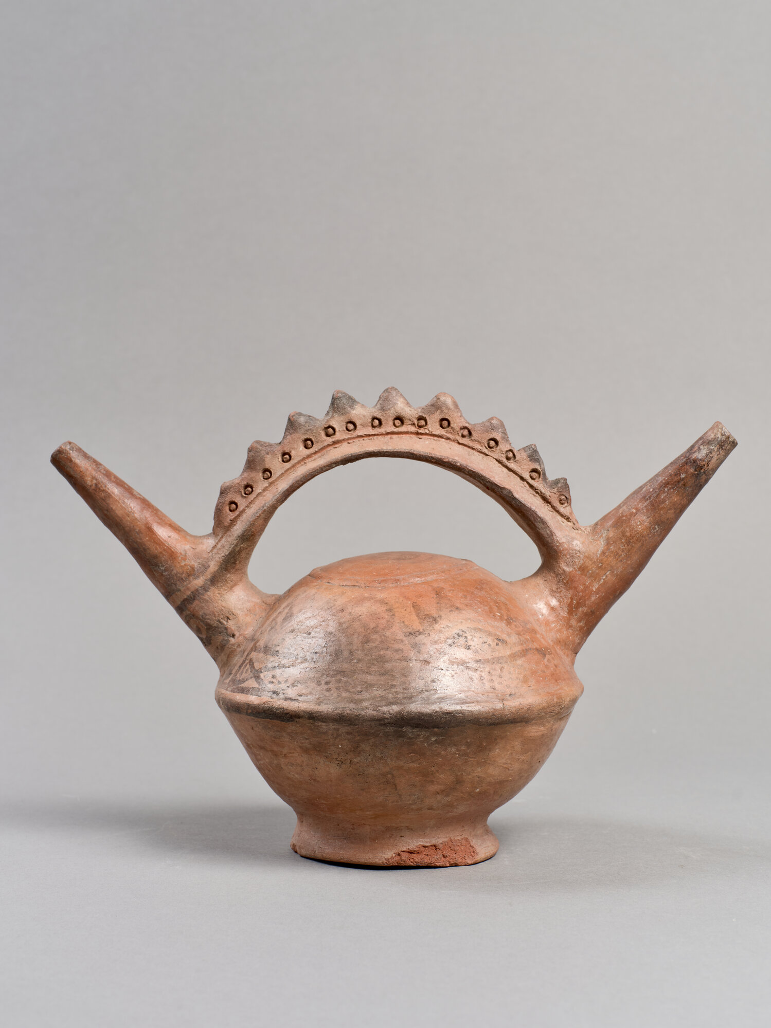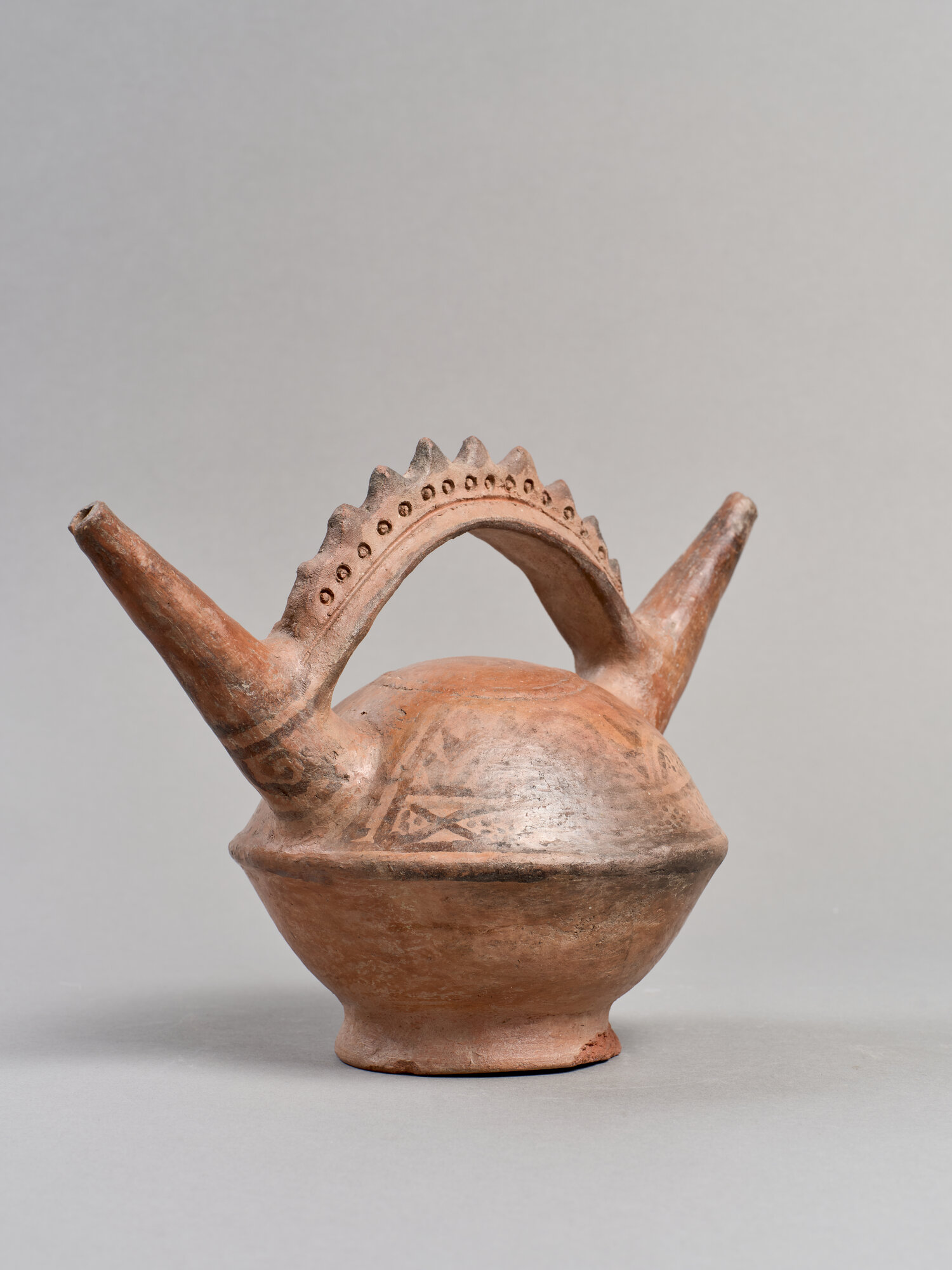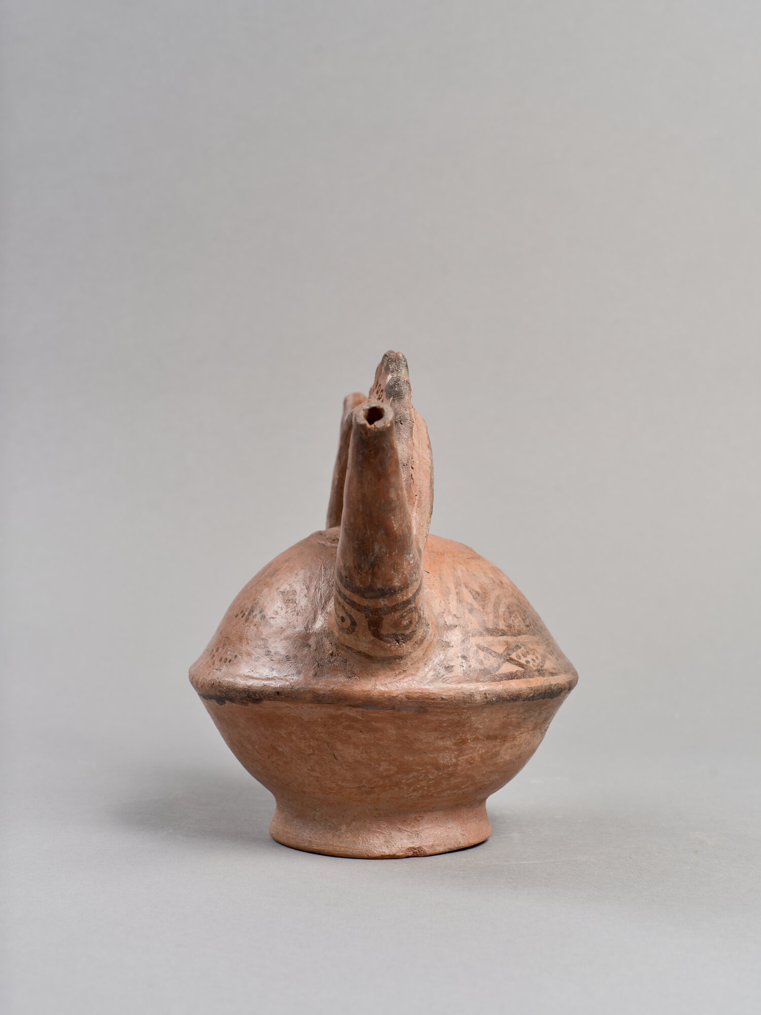 Contenitore di colore rosso aranciato, con piede distinto ad anello e camera caratterizzata da una marcata carenatura. La parte superiore della camera è decorata da due registri: il primo a rombi puntinati in nero all'interno; il secondo da quattro semicerchi concentrici crestati, forse rappresentazione di soli, ognuno sormontato da una figura zoomorfa stilizzata in nero. Sulla sommità della camera è presente un disco bordato a rilievo. I due colli troncoconici divergenti sono uniti da un'ansa a nastro crestata, decorata con motivi circolari impressi