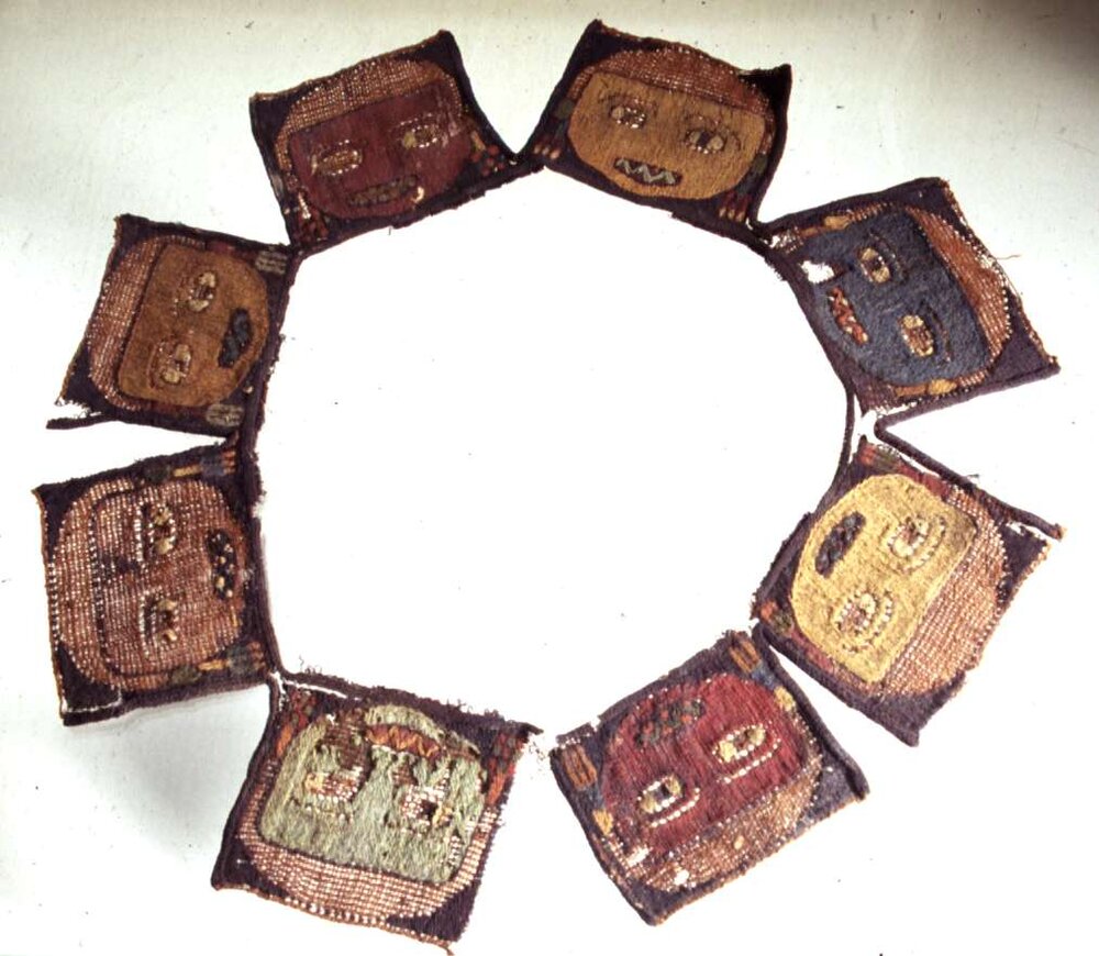 Bordo con anima in tela leggermente a faccia di ordito in cotone naturale marrone costituito da vari riquadri tenuti insieme dal ricamo stesso. Il ricamo a punto ad erba in fibre camelidi naturali e tinte (marrone, giallo, blu, rosato, verde, rosso, bordeaux, bianco/grigio, verde acqua, verde bottiglia, corda, rosa e arancio) disegna una testa antropomorfa con pendenti auricolari per ogni riquadro