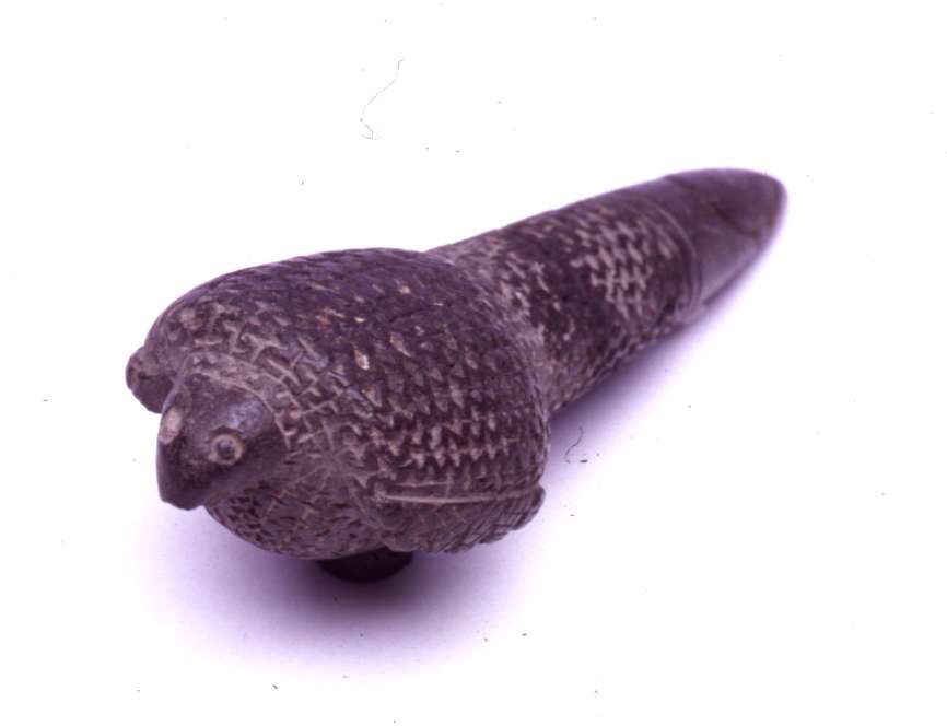 Figurina zoomorfa realizzata in pietra scolpita monocroma grigio-nera che raffigura un armadillo con occhi e bocca incisi. Tutto il corpo, tranne la parte terminale della coda e la testa, è ricoperto da fitte incisioni che simulano la corazza a scaglie dell'animale