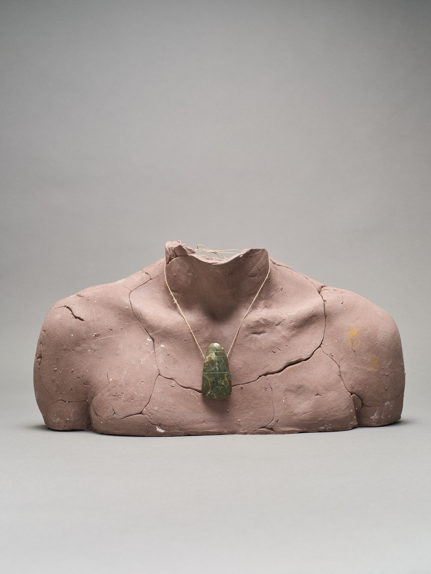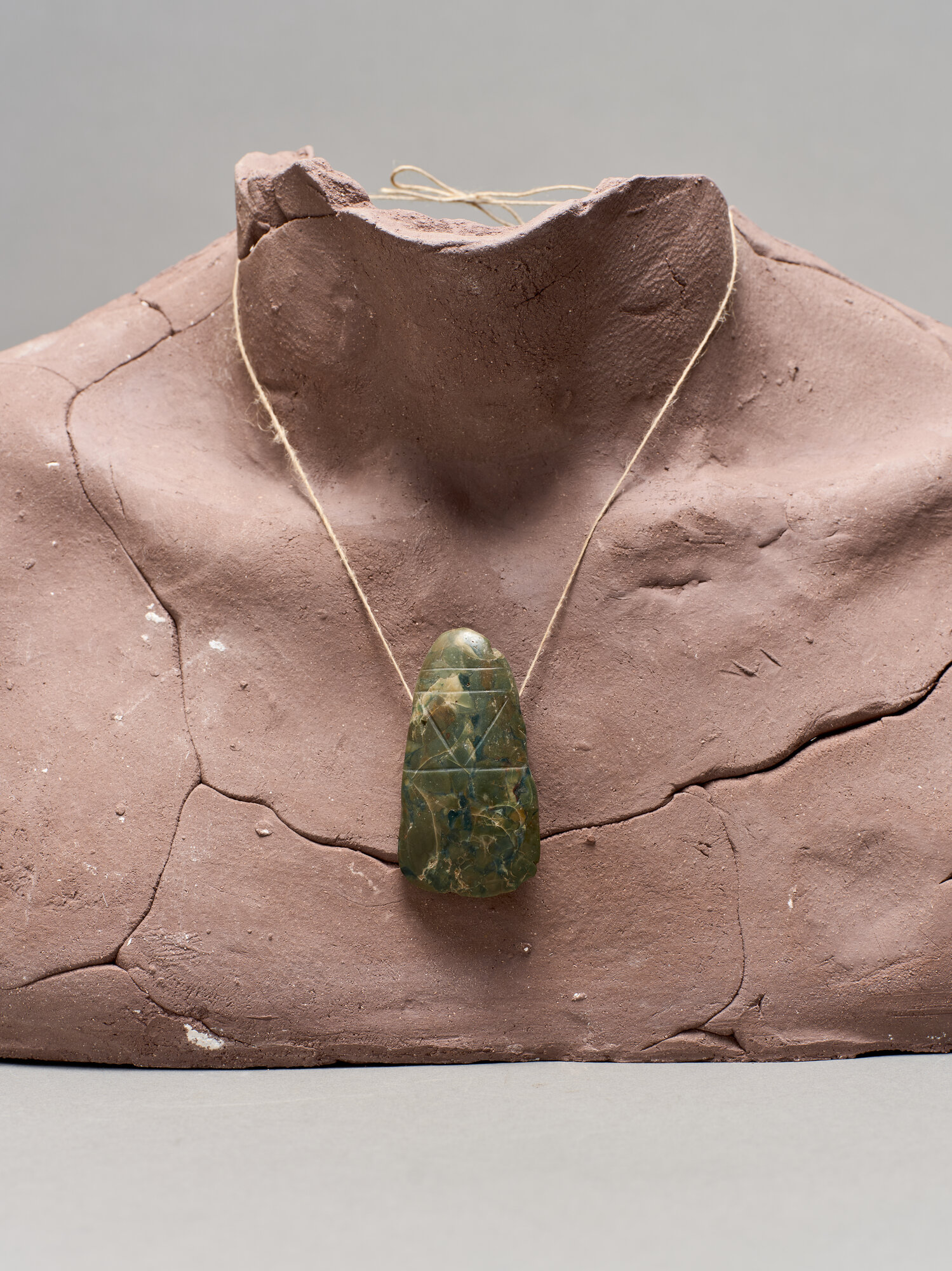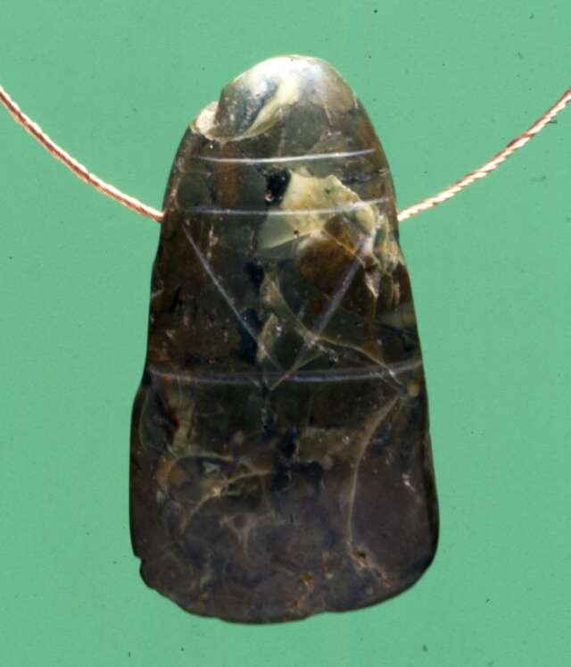 Pendente in giadeite verde con venature verde scuro e crema. L'oggetto è stato lavorato a forma di ascia dal taglio arrotondato, con due linee orizzontali e un motivo a triangolo incisi a formare un volto umano stilizzato. Presente il foro di sospensione