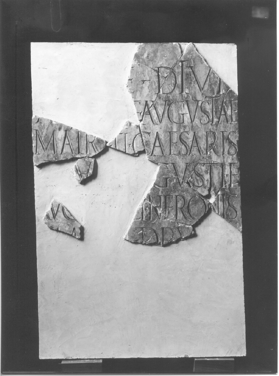 - ISCRIZIONI [IULIA]E DIVI / A[UGUSTI] F(ILIAE) AUGUSTAE / MATRI TI(BERII) CAESARIS / [DI]V[I AU]GUSTI F(ILII) / AUG[USTI] ET NERONIS / [C]LAU[DI] DRU[SI] - capitale romana - a solchi - latino