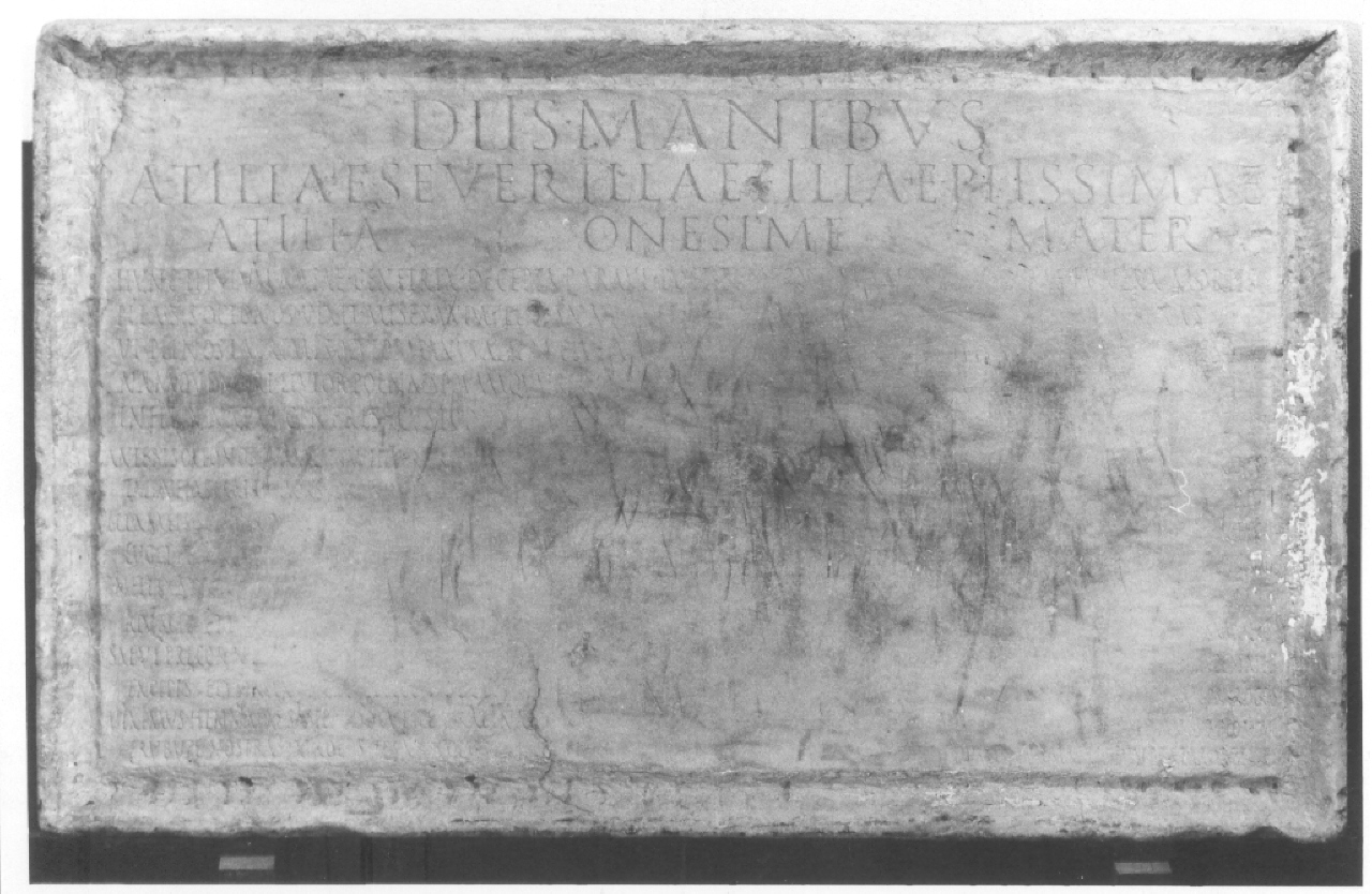 - ISCRIZIONI entro cornice modanata - DIIS MANIBUS / ATILIAE SEVERILIAE FILIAE PIISSIMAE / ATILIA ONESIME MATER / UNC TITULUM NATAE GENETRIX DECEPTA PARAVI / POST T[E]N[ERO]S MANES ET ACERBAE FUNERA MORTIS / ILLA BIS OCTONOS VIXIT MISERANDA PER ANNOS / ELEGIT [QUE SUB HAC NON TRISTES LEGE] TENEBRAS / UT PLENOS LACRIMIS OCULOS MANUS ALTERA CLUDAT / [ILLA PRIOR MORIENS FATIS MELIORIBUS] USA EST / NAMQUE MORI LEVIOR POENA EST QUAM QUAERERE MOR[TEM] / […] / INFELIX NATAE CINERES CUSTODIO MATER / […] / ANTE BIS OCTONOS QUAM LUX MIHI VERTERET [ANNOS] / TALE NEFAS MATRI MORS PROPERATA [TULIT] / ILLA MEIS SEMPER TU[MULIS MISERABILIS HAER]ET / LUGET ET IN NOSTR[A SOLA RELICTA DOMO / INFELIX STYGIO V[OLT VITAM DEDERE REGI] / ADIACET ET TU[MULIS TALIA SAEPE QUAERENS:] / SAEVE, PRECORNE [FATA NEGES; QUIN ME QUOQUE SEDE] / EXCIPIS ELISIAR[…] / VIXIMUR: HENNAEAE SITE DOCUERE RAPINAE / [.] ERUBUIT NOSTRAS ATROPOS IPSA COLUS / R[…CO]RPORE SAC[RA] / […] TORO / […]A DOMOS / [AMPLEXU DUM VERBA REFETT TENET IL]LA SEPULCR(UM) / ADMOVET AD MANES MOLLIA LA/BRA MOES / SIC ANIMA EXORITUR TUMULO VISURA PENATES / ET QUOS MORTE MEA FUGE]RAT IPSA ROGAS / VIVIT […] SIC ANIMAE MANES(QUE) PIORUM / DUM VENIO MATRIS FUNERE TARDA COMES - capitale romana - a solchi - latino