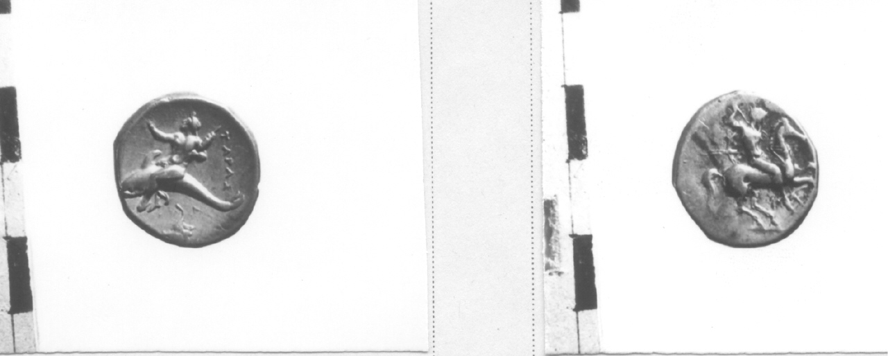 Diritto: Figura maschile, giovanile, con piccolo corno sulla fronte, su delfino, a sinistra, tiene la destra levata e stringe nella sinistra conocchia o turbo, dietro iscrizione. Rovescio: Cavaliere ignudo, su cavallo al galoppo, a destra, in atto di puntare la lancia