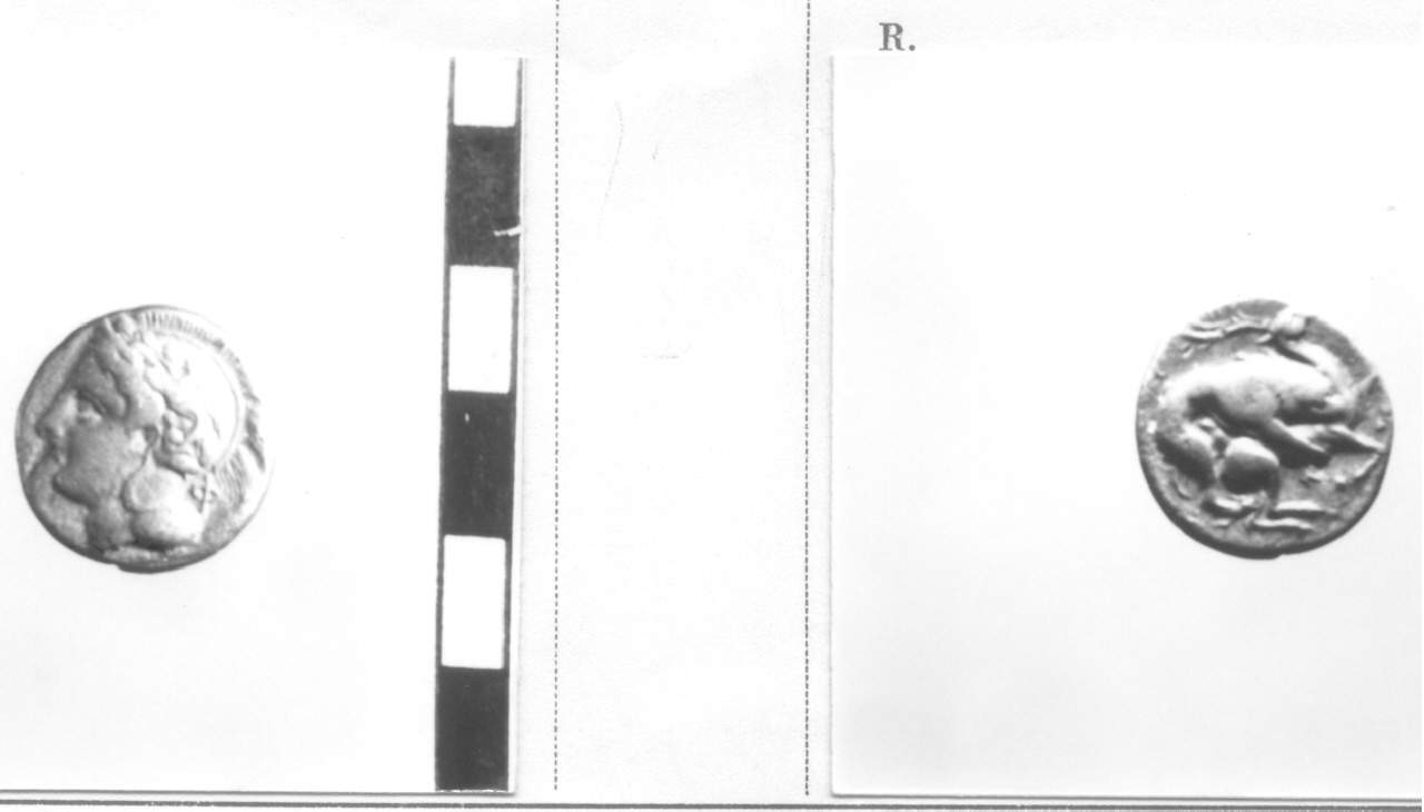 Diritto: Testa di Atena, a sinistra, con elmo ornato da corona e grifone; dietro lettera greca PH. Rovescio: Leone che azzanna un cervo, a destra; iscrizione