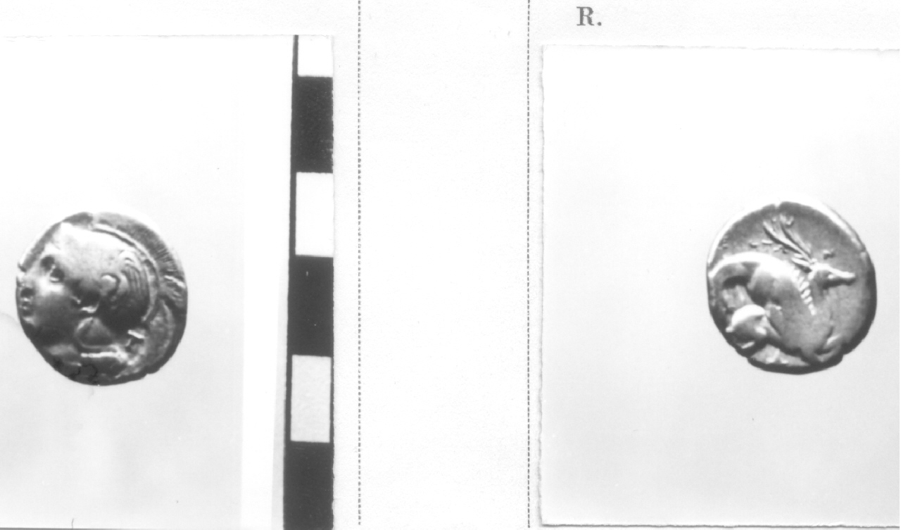 Diritto: Testa di Atena, a sinistra, con elmo ornato da un grifone; sotto la nuca lettera greca T. Rovescio: Leone che azzanna un cervo, a destra; sotto, foglia di edera; iscrizione