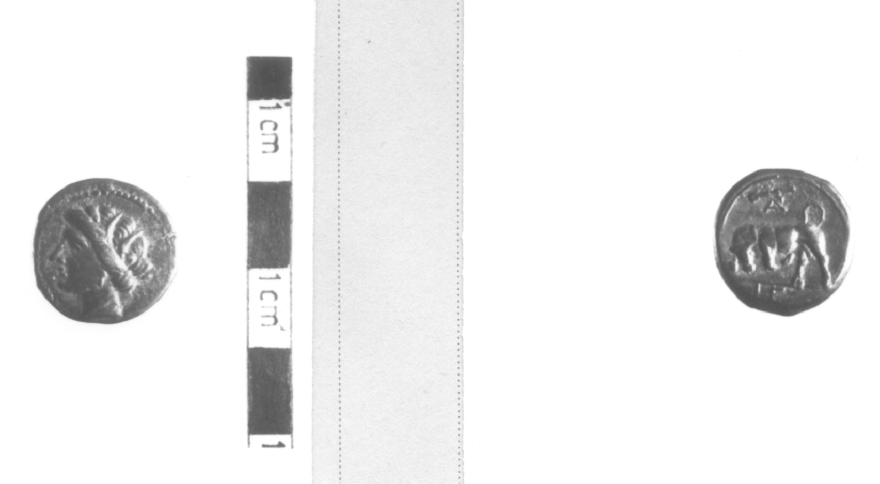 Diritto: Testa di Core a sinistra. Rovescio: Toro cozzante a sinistra; sopra, clava e monogramma (?); in esergo, iscrizione