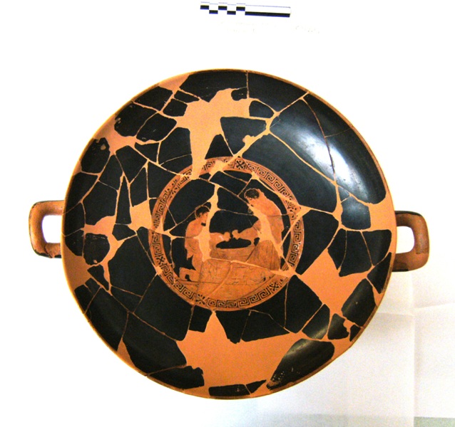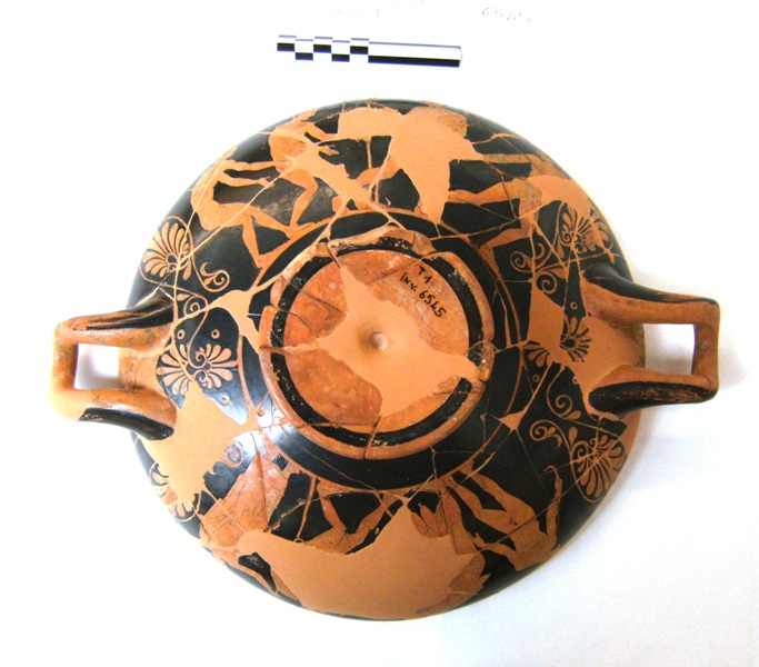 Medaglione costituito da fascia decorata a meandro intervallato da quadrati con motivi a X, all’interno scena figurata. Piede a v.n. con fascia a risparmio; al disotto a risparmio con fascia a v.n. A risparmio l’area attorno alle anse. Vernice nera lucida coprente, in alcuni punti leggermente evanide. Argilla rosata