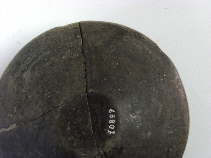 Orlo assottigliato, labbro svasato, spalla compressa, vasca troncoconica, fondo ombelicato, ansa sormontante a nastro. Spalla decorata da tacche oblique. Sull'impostazione dell'ansa all'orlo e sulla parte esterna della vasca graffiti dopo cottura