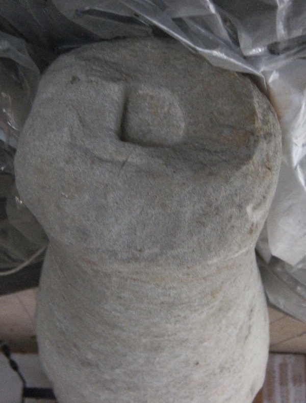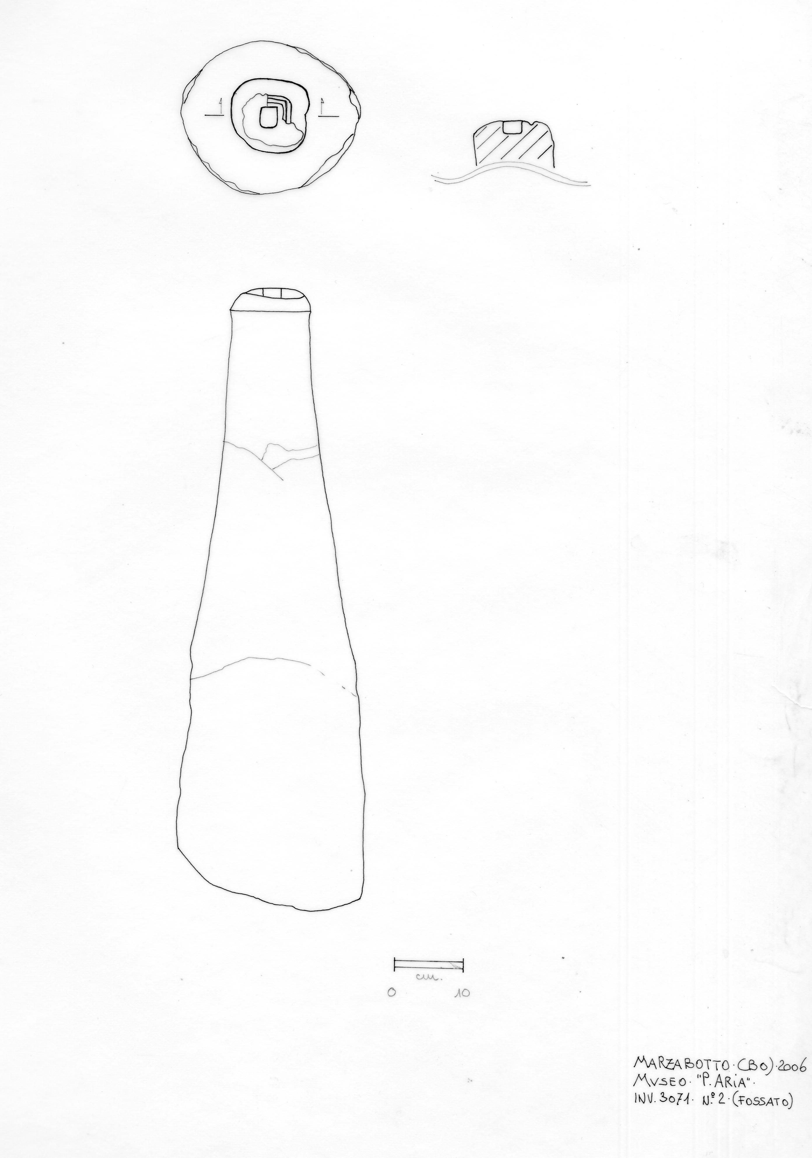 Cippo di forma troncoconica a sezione irregolarmente circolare in arenaria, parte inferiore più espansa sbozzata. Spezzato in due parti verso l’estremità superiore più ridotta, sulla quale è conservata parte di un incavo a profilo quadrangolare che in profondità assume forma circolare