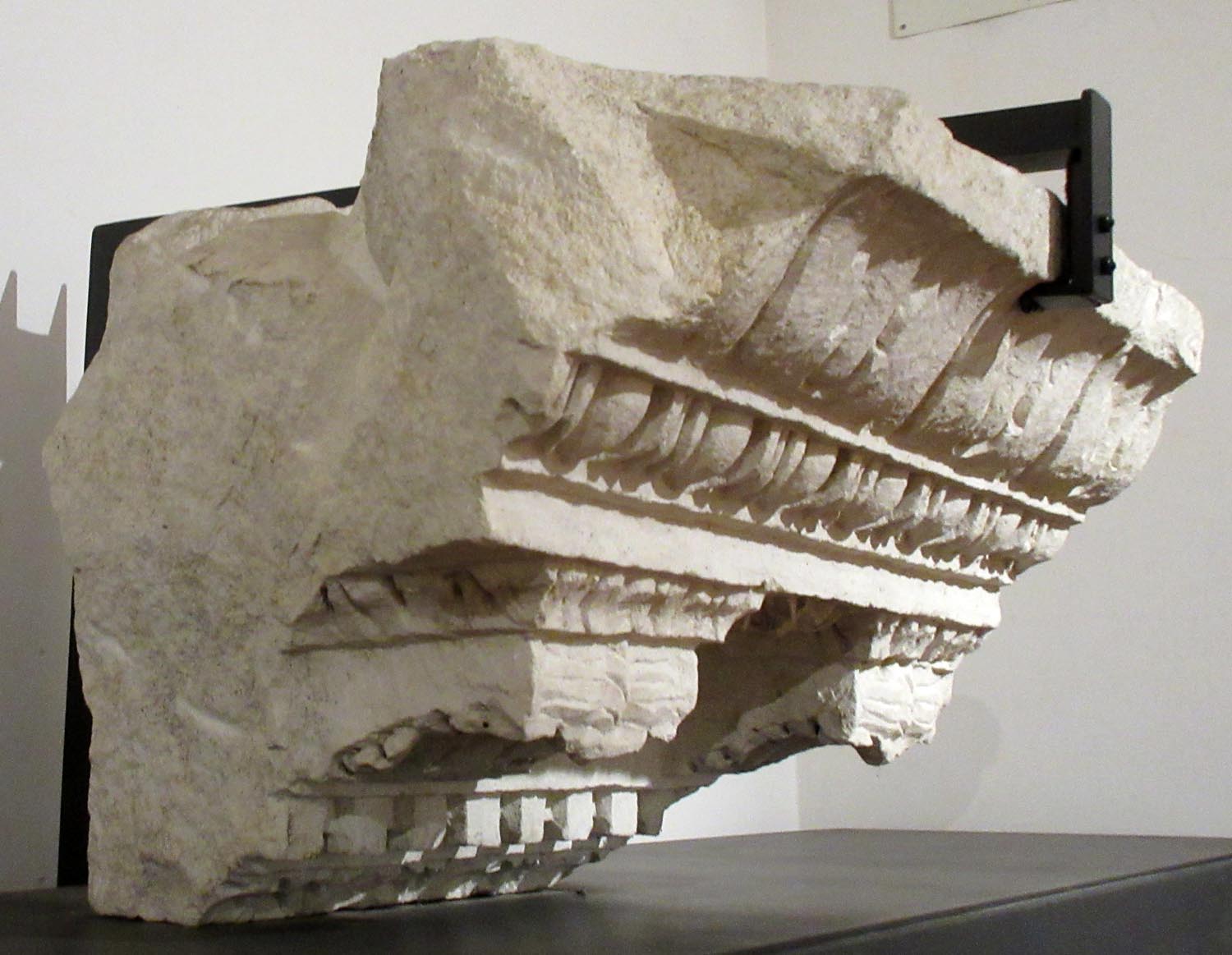 Tratto di trabeazione in marmo bianco con mensole. Sottocornice costituita da una fascia con modanatura a kyma lesbio continuo, sormontata da dentelli. Soffitto con fascia di appoggio delle mensole liscia, mensole ornate da foglie d’acanto, corona a kyma lesbio. Sopracornice con peduncolo, fascia a kyma ionico ad ovoli e freccette, sima a foglie dentellate di profilo inquadranti motivo lanceolato centrale