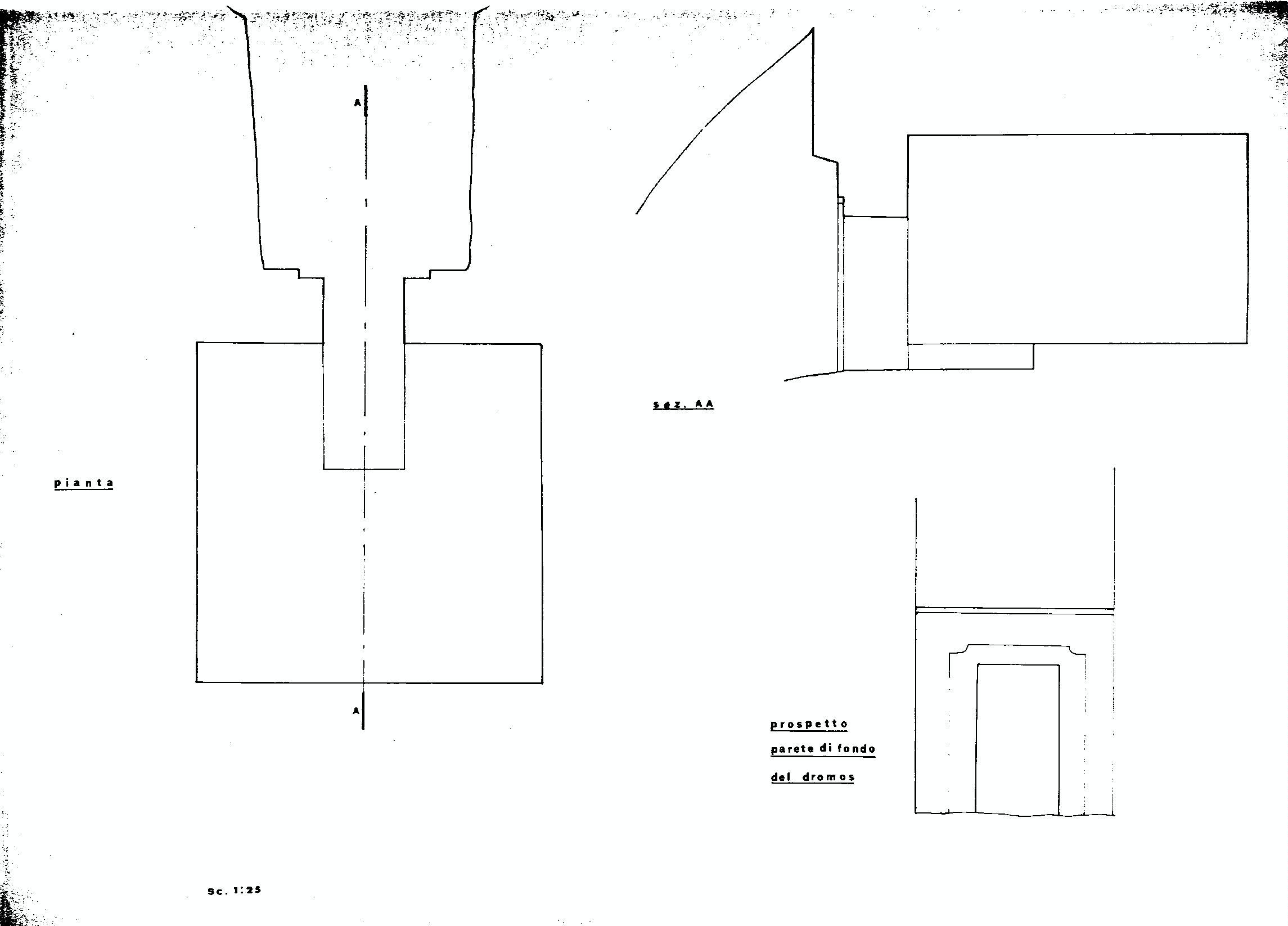 Scolpita. Ingresso rettangolare aprentesi al fondo di un largo dromos, le cui pareti laterali sono conservate per una lunghezza di cm.200 circa. L'ingresso è inquadrato da un largo pianetto ribassato (profondo cm.5), decorato agli angoli da due elementi sagomati. Al di sopra dell'ingresso, una seconda cornice, maggiormente aggettante (cm.20 circa), si estende orizzontalmente per tutta la larghezza della parete di fondo del dromos. Superiormente la parete è spianata per un'altezza di cm.130 circa. Cella rettangolare, lunga cm.270, larga cm.275, alta cm.187, fornita su tre lati di banchine bassissime (solo cm.20) ed estremamente larghe (cm.110 a sinistra, cm.100 a destra; cm.170 sul fondo)