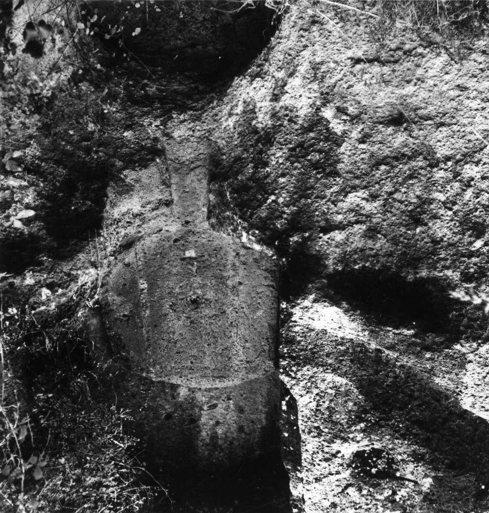 Scolpita. La tomba sorge a poche decine di metri ad Est della 'Tomba del Tifone'. La sovrastruttura a dado è scolpita all'interno di una sorta di nicchia arcuata. La facciata, limitata lateralmente da trincee larghe a sinistra m.0,15, a destra m.0,20, scarsamente rastremata, presenta falsa porta a proiecturae ricurve, costituita da un listello largo m.0,05. In alto non si conservano tracce di coronamento. Al di sopra, si riconoscono due bassi elementi parallelepipedi sovrapposti, da interpretare come il plinto con il suo portacippi, fortemente corrosi e scarsamente aggettanti. Sul fondo della nicchia, al di sopra della sovrastruttura terminale del monumento, sono stati praticati nella roccia numerosi fori rettangolari, disposti approssimativamente in due file. Alla base della facciata restano tracce del dromos. A m.0,70 circa sotto il piede della facciata si apre una larga cavità profondamente corrosa, che esibisce tracce di una banchina, alta m.0,25, corrente su tre lati