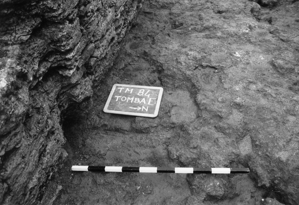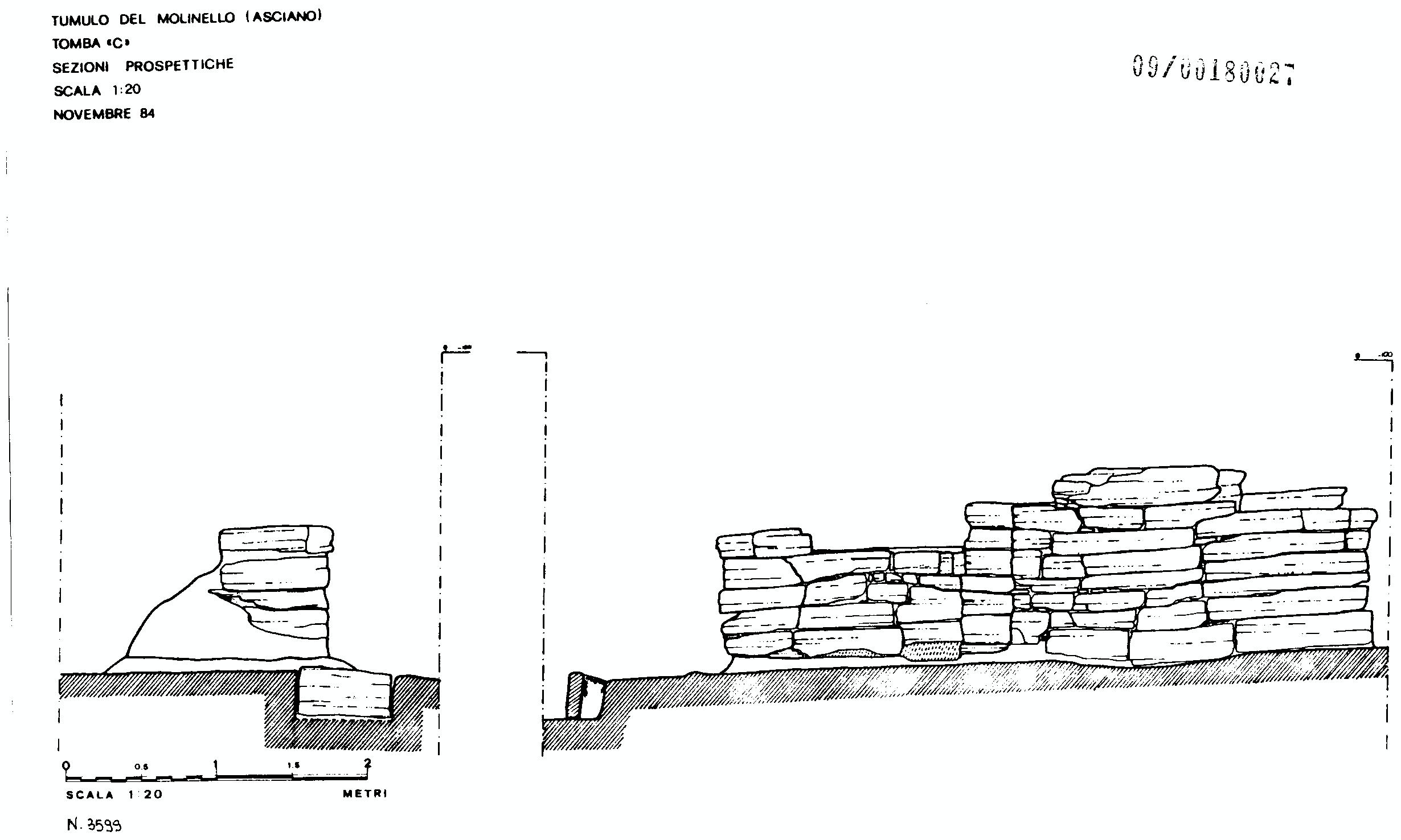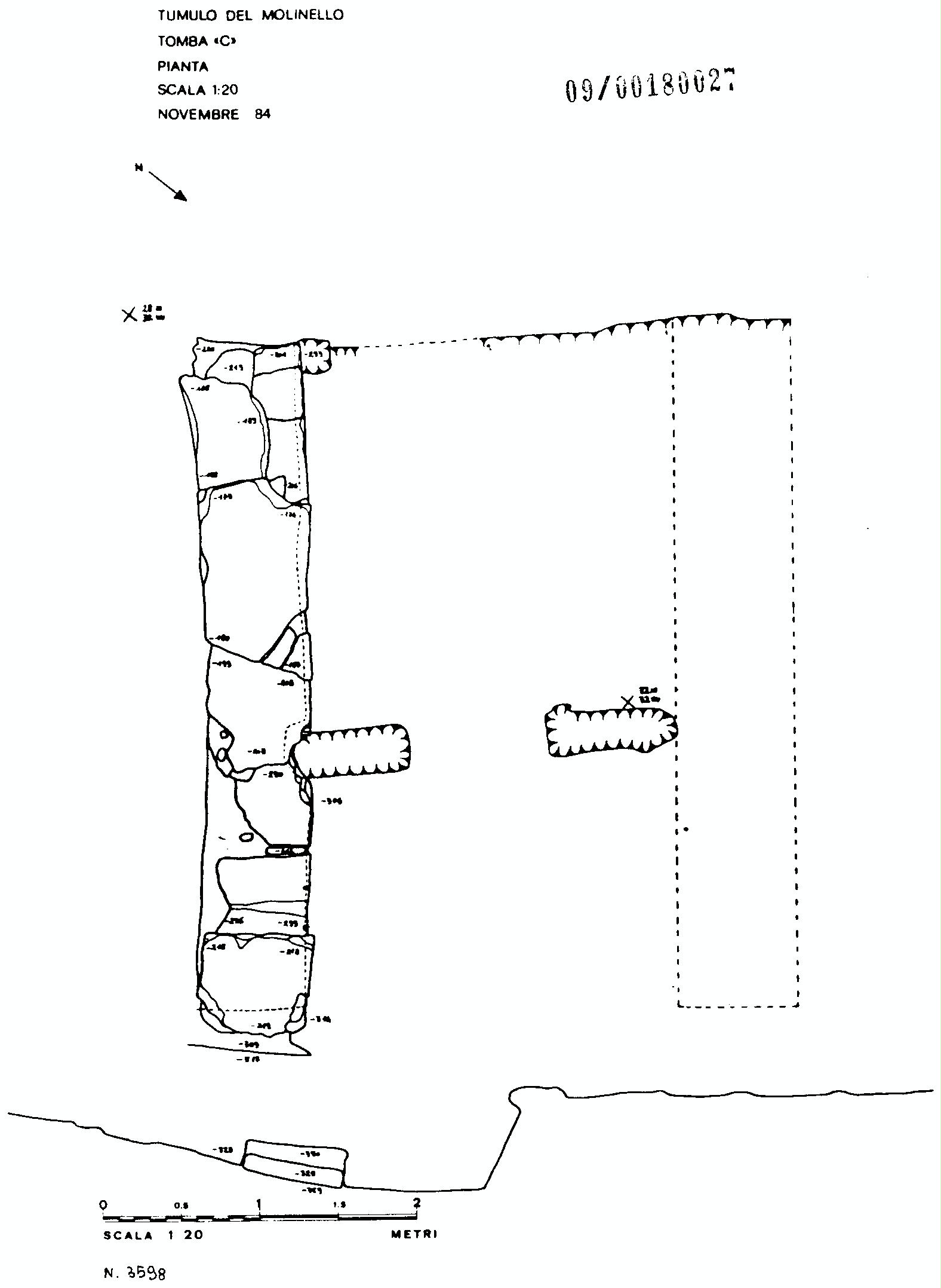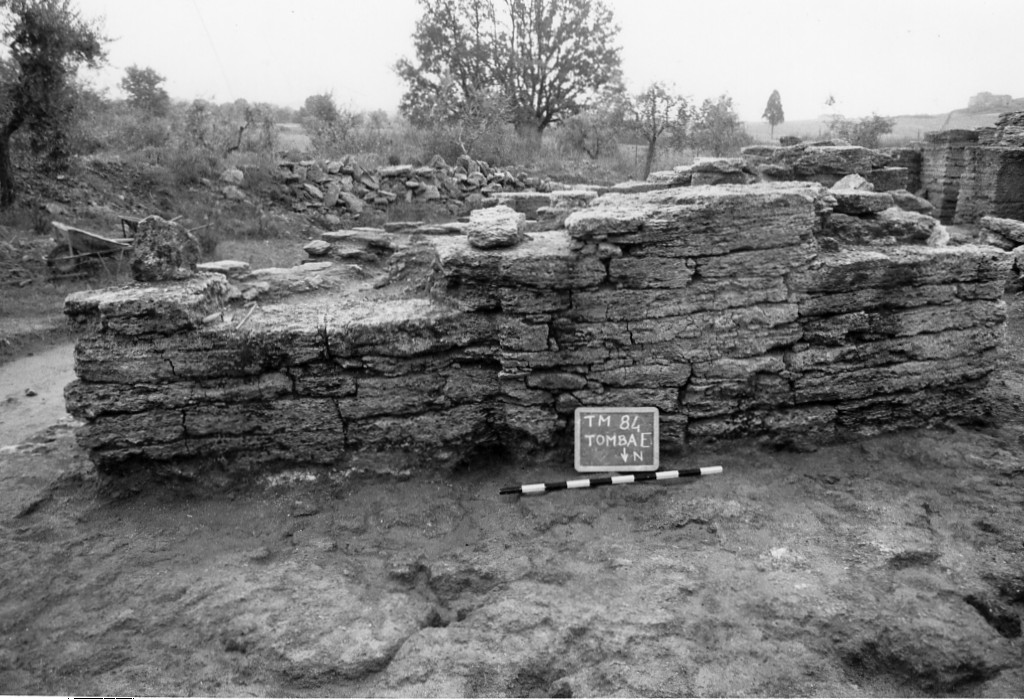 Tomba a camera costruita con blocchi di travertino con ingresso ad E. Della tomba rimane unicamente la parete S con visibile al centro una scanalatura a cui corrispondono, sul piano pavimentale, due incavi intagliati nella roccia di base, per l'inserzione di divisori. E' ipotizzabile una pianta rettangolare (lungh. cm.430, largh. cm.235) per la presenza ad W di un ulteriore incavo nella roccia di base e di un blocco residuo (misure max conservate: h. cm.18, lungh. cm.50, p. cm.40), probabilmente relativo alla parete di fondo. La parete S, ancora in posto, è conservata per un'altezza massima di cm.125 ed è costruita sovrapponendo a secco blocchi rettangolari di travertino (misure medie: h. cm.25, lungh. cm.100, p. cm.70) regolarmente squadrati. Il filare alla base poggia su una sottile preparazione in terra mista a schegge di travertino. La tomba probabilmente non aveva dromos in quanto il limite E della parete ancora in posto arriva in prossimità del tamburo interno. Il piano pavimentale è ottenuto regolarizzando con un sottile strato di argilla il taglio della roccia base