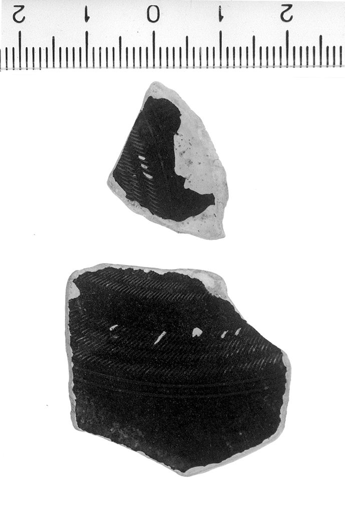 Parte del fondo con serie di rotellature radiali di tratti molto sottili.Argilla beige; vernice nera lucente