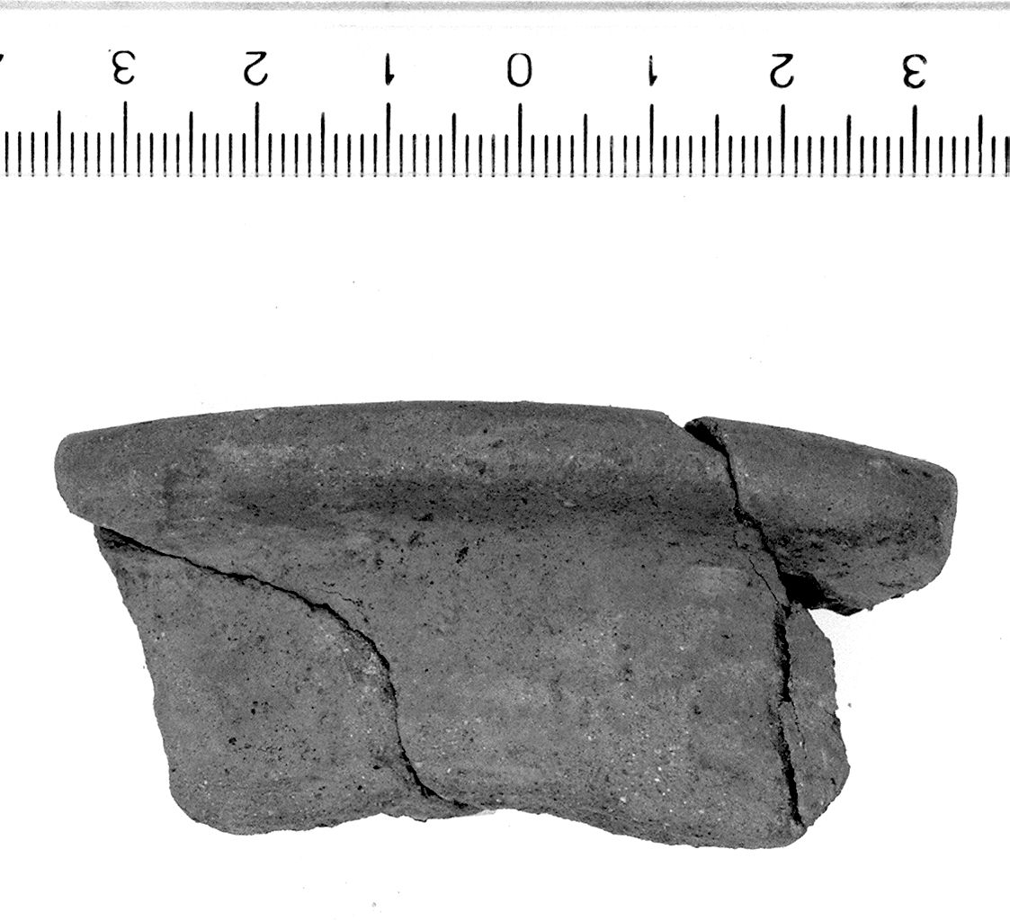 Orlo estroflesso a tesa obliqua verso il basso, con bordo arrotondato; collo cilindroide (appena accennato). Impasto arancione; presenti minuti e piccoli inclusi biancastri e incolori. Sulla superficie, ingubbiatura di colore camoscio