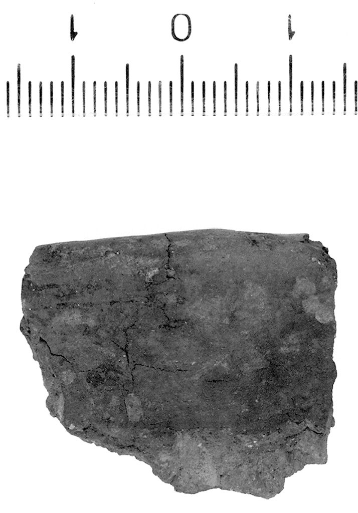 Orlo verticale, con bordo a sezione quadrangolare, a raccordo fluido con il collo, cilindrico. Impasto bruno-nerastro; presenti inclusi piccoli e medi di vari colori