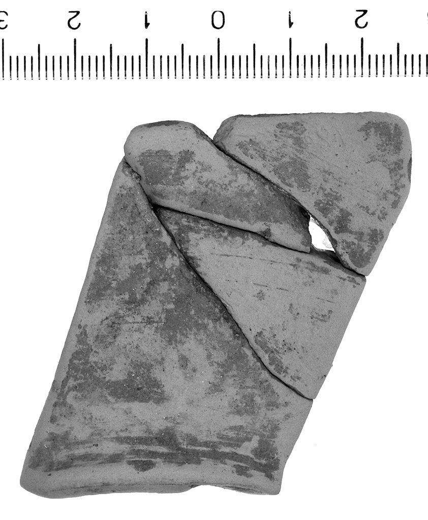 Ventre rastremato a profilo convesso; piccolo piede a disco con fondo esterno concavo, probabilmente pertinente ad una brocchetta. Tracce di decorazione dipinta a vernice rossa, probabilmente a fasce. Argilla depurata; colore rosato