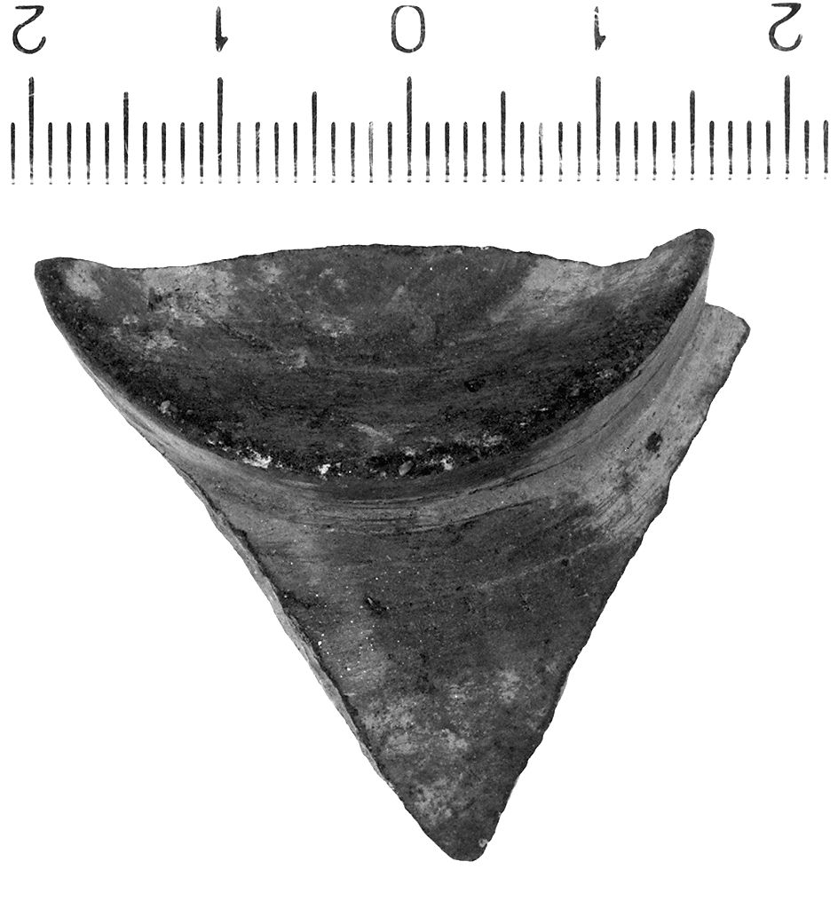 Fondo convesso; piede ad anello con piano di posa assottigliato e profilointerno obliquo. Superficie lisciata. Bucchero nero, piuttosto lucente, con inclusi puntiformi lucenti