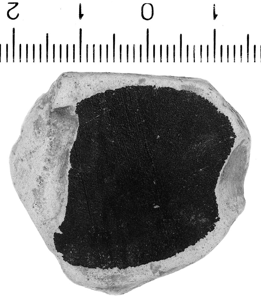 Forma subcircolare. Ritagliata da parete a profilo convesso. All'esterno,resti di decorazione in vernice bianca, molto diluita, con fascia ed elemento lanceolato verticali, paralleli. Argilla arancio. Vernice nera, coprente e lucente, con macchie iridescenti