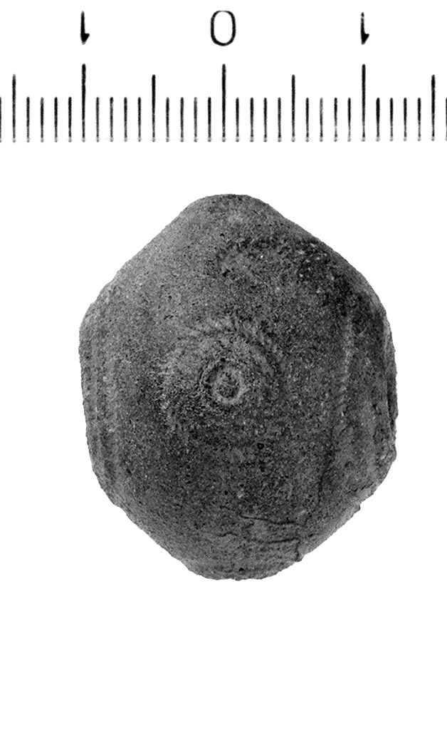 Corpo biconico a base quadrangolare, con vertici pronunciati; foro passante circolare. Decorazione impressa a cordicella: attorno al foro, doppi cerchi concentrici; ai quattro vertici, doppi cerchi concentrici con punto centrale. Impasto semidepurato, rossastro, con inclusi puntiformi bianchi