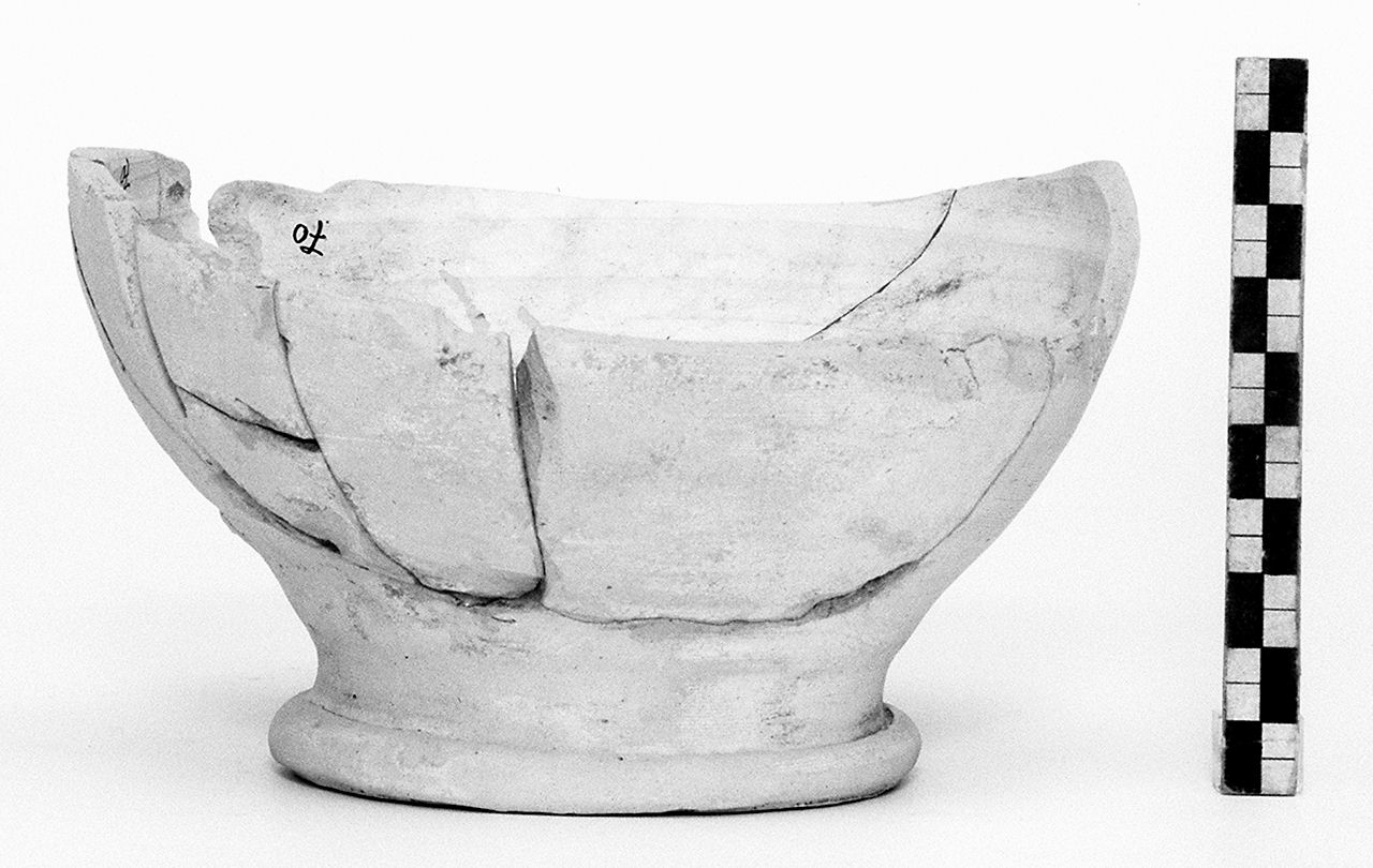 Corpo globulare, rastremato in basso; fondo con piede a disco rilevato con bordo sagomato. Sul piede, ampio foro passante decentrato, eseguito dopola cottura. All'interno, solcature di tornitura; sotto il piede, striature di distacco dal tornio. Superficie coperta da una ingubbiatura bianca, densa all'interno, diluita all'esterno e con colature. Base inferiore del piede risparmiata. Argilla rosata