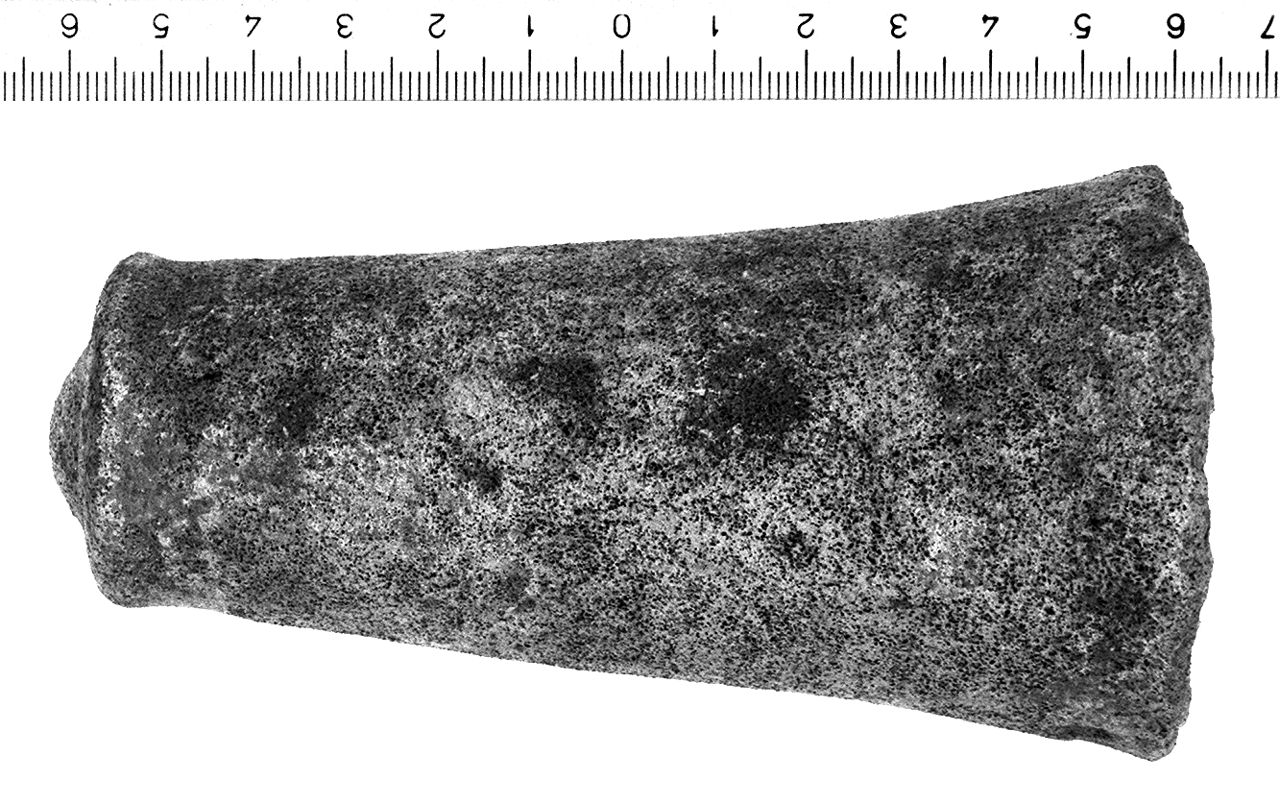 Forma cilindrica, piena; base a bottone. Tracce di ingubbiatura color crema. Argilla beige-arancio, con diffusi inclusi puntiformi, neri lucenti