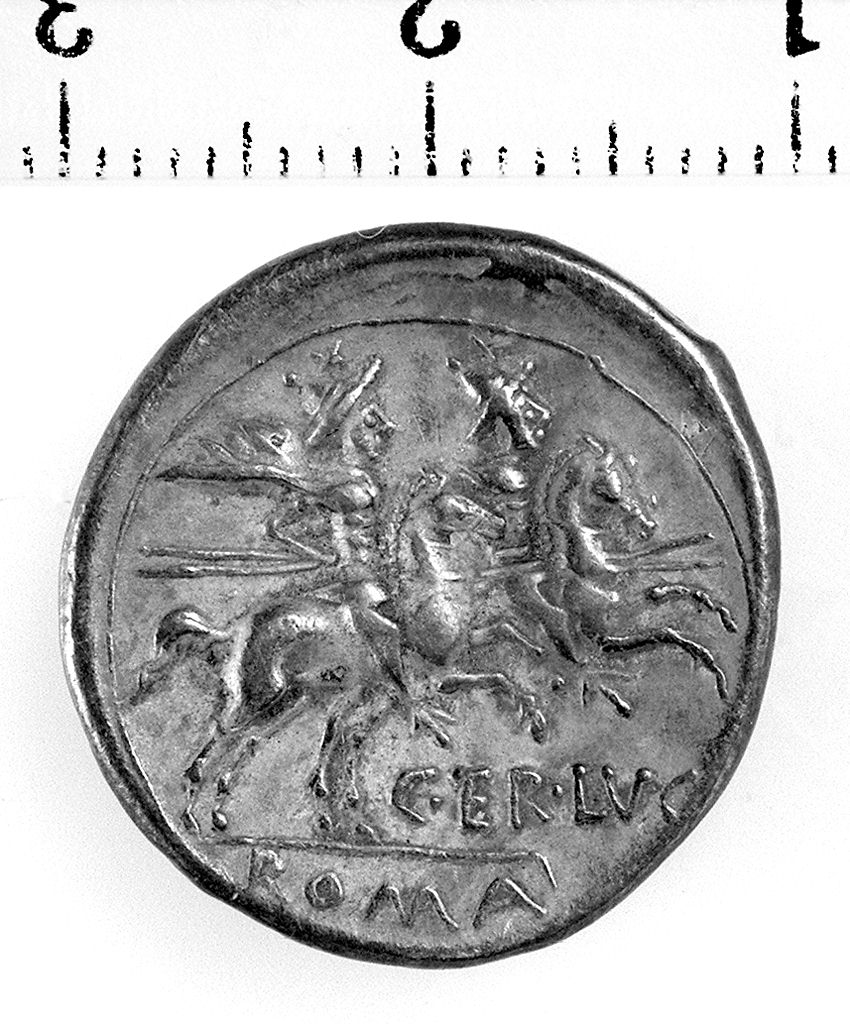 D/ Testa di Roma a d. con elmo alato a testa d'aquila; dietro Vittoria con corona e X. R/ I Dioscuri al galoppo verso d. con clamide e pileo