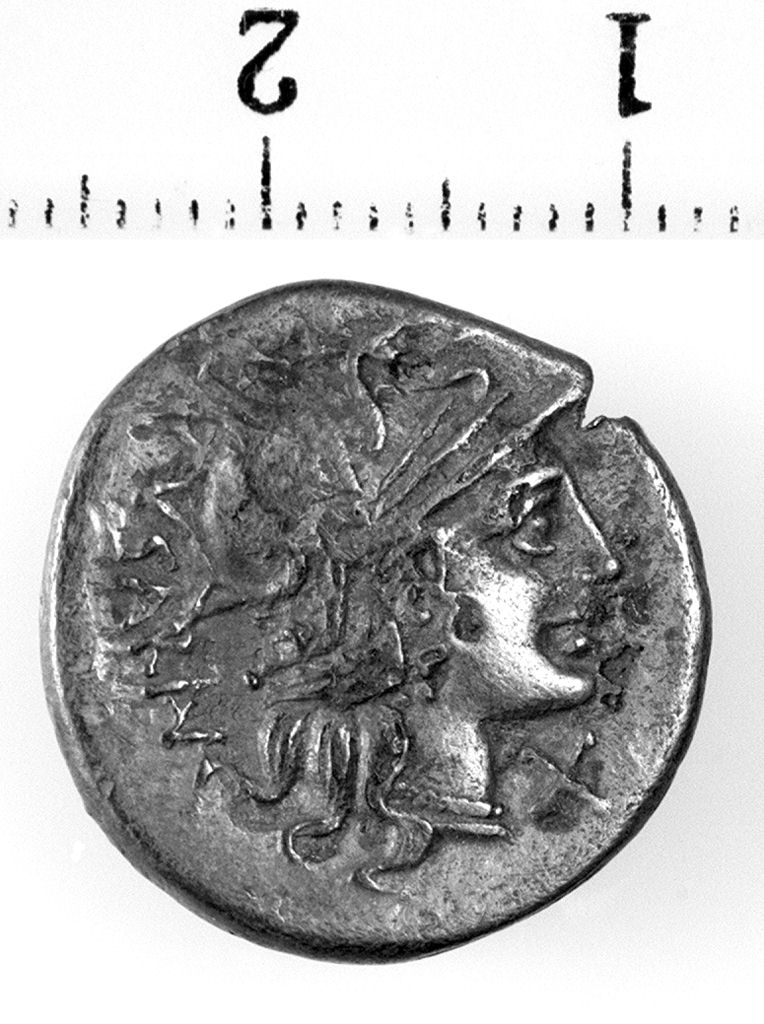 D/ Testa di Roma con elmo alato a d. Davanti : X. R/ I Dioscuri al galoppo verso d.