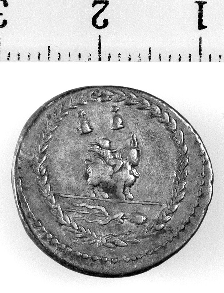 D/ Testa di Apollo Vejovis, con boccoli calmistrati; sotto monogramma e fulmine. R/ Genietto alato di Apollo infante che cavalca la capra Amaltea ad.; sopra: i berretti dei Dioscuri, ciascuno sormontato da una stella; sotto: tirso. Il tutto entro corona d'alloro