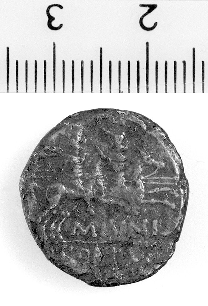 D/ Testa di Roma a d. con elmo alato; dietro testa d'asino; davanti X. R/I Dioscuri a cavallo verso d