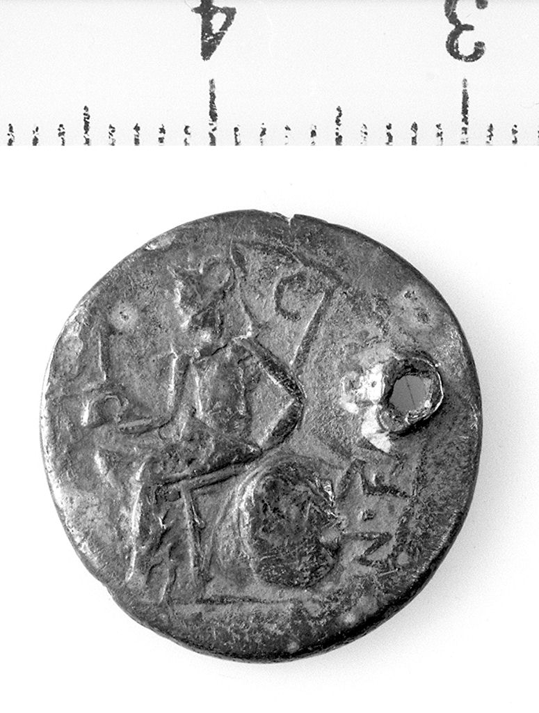 D/ Testa di Roma a d. con elmo alato; davanti I, dietro *. R/ Il flamen Quirinalis Q. Fabio Pittore, galeato, seduto a s. tenendo apex e asta appoggiata a scudo iscritto