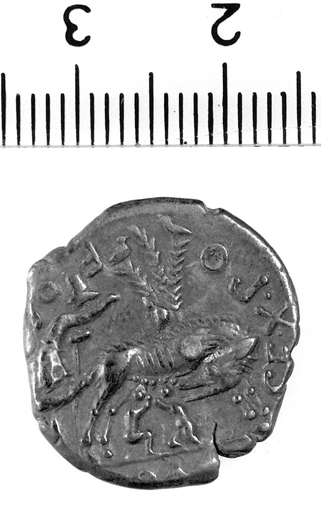 D/ Testa di Roma con elmo alato a d. Dietro: tazza (capis). Davanti: X. R/ Lupa stante con il muso rivolto all'indietro mentre allatta i gemelli sotto il fico ruminale su cui sono tre uccelli. A s. il pastore Faustolo stante