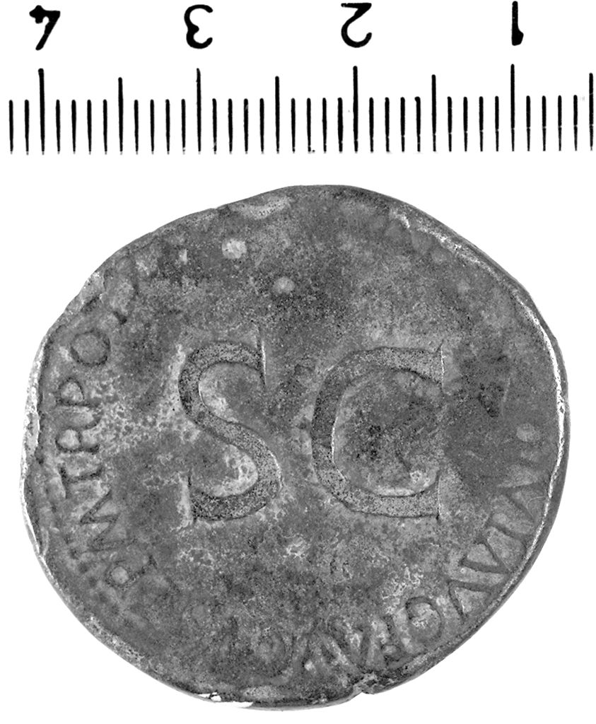 D/ Tiberio seduto a s. con patera e scettro. R/ Iscrizione al centro