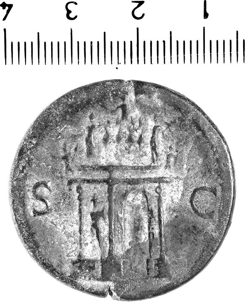 D/ Testa laureata di Nerone a s. R/ Arco di trionfo con la quadriga di N.tra le statue della Pace e della Vittoria