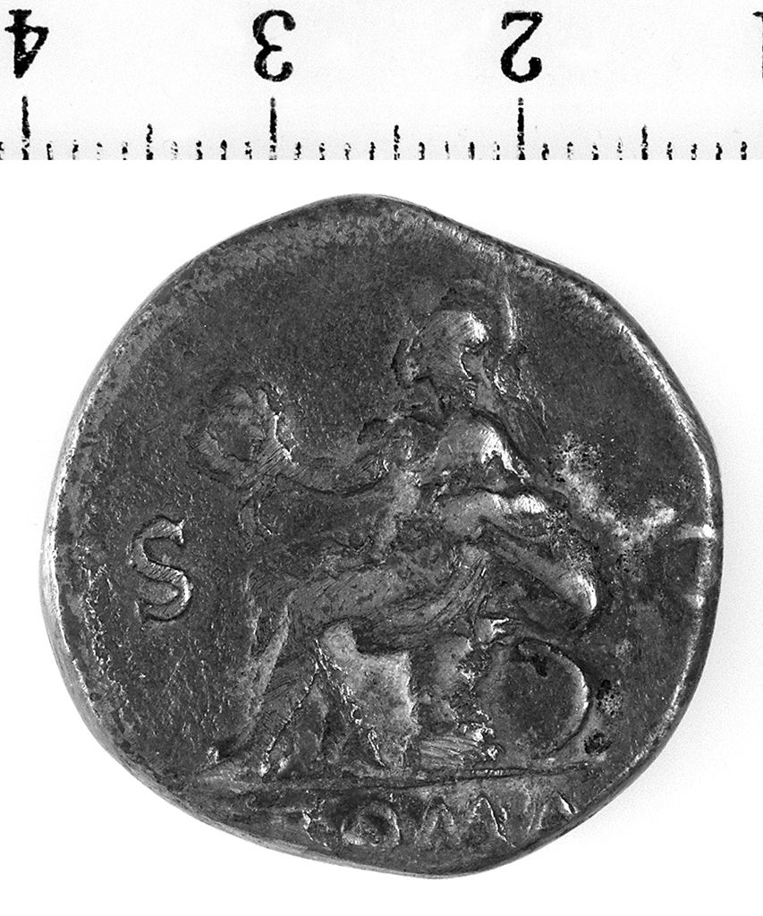 D/ Testa radiata di Nerone a d. R/ Roma galeata seduta a s. su corazza. col piede posato su un elmo, tiene il parazonio ed una corona; dietro, scudo