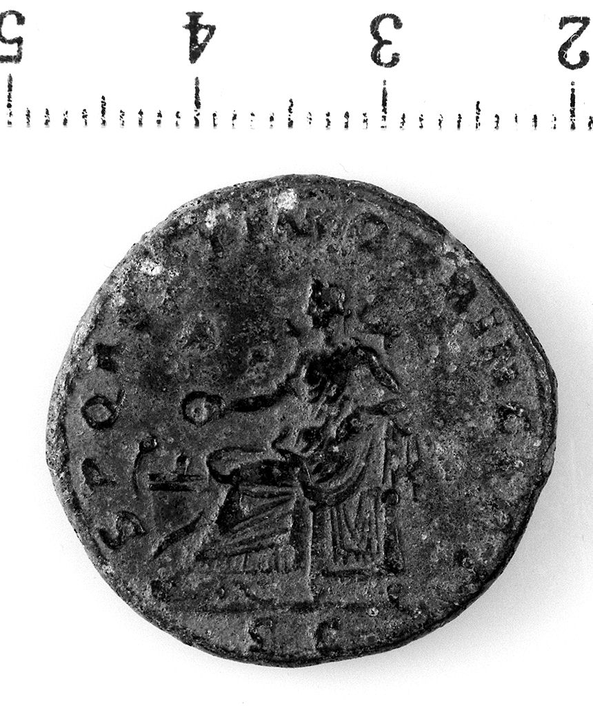 D/ Testa radiata di Traiano a d. R/ La Salus seduta a d. con patera presso ara su cui è avvolto un serpente