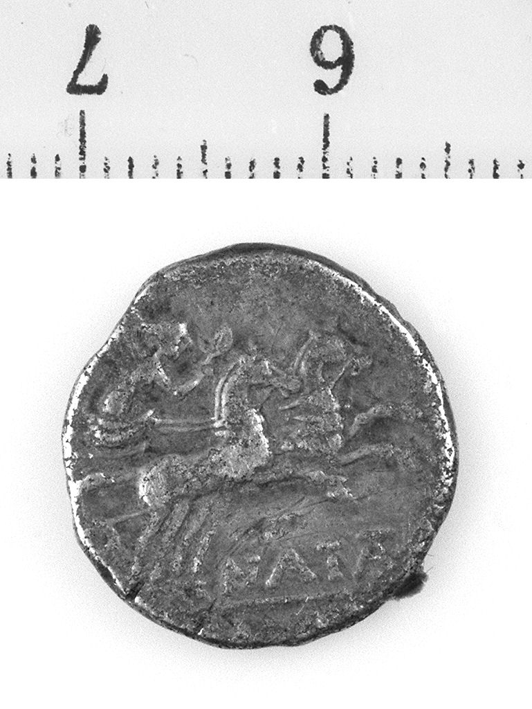 D/ Testa di Roma con elmo alato a d.; segno di valore: X. R/ Vittoria su biga al galoppo verso d