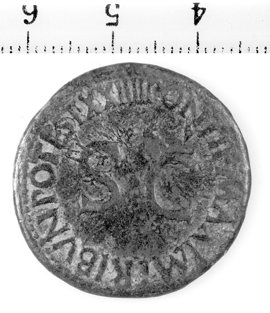 D/ Testa di Tiberio a s. R/ Iscrizione al centro