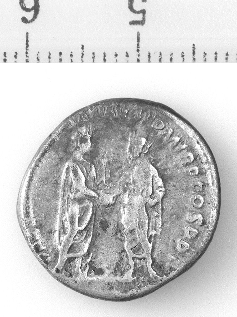 D/ Busto di Adriano laureato, a d. R/ Traianovolto a s., in atto di stringere la mano ad Adriano, volto a d., entrambi togati