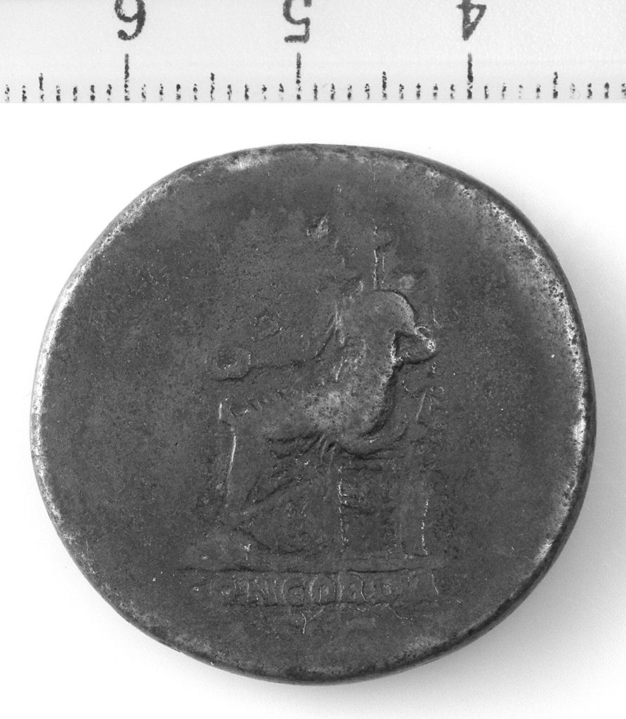 D/ Busto di Adriano laureato, a d., con drappeggio sulla spalla s. R/ La Concordia assisa a s. ostenta la patera e poggia il gomito s. sulla statuetta della Spes