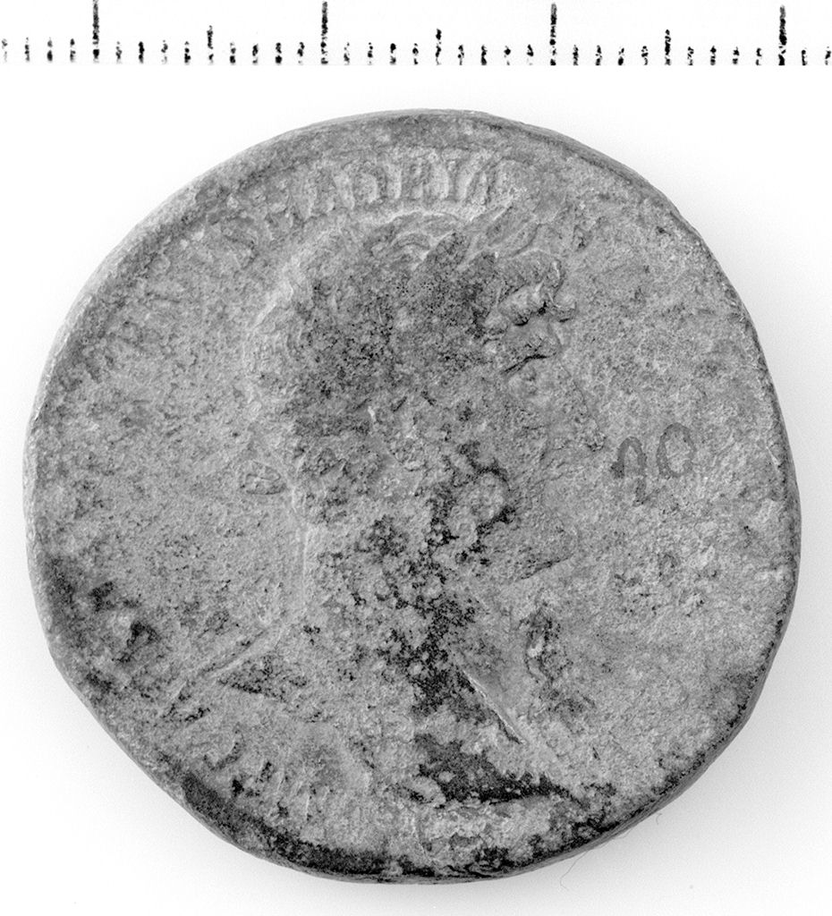 D/ Busto di Adriano laureato a d. R/Adriano togato, stante a s. solleva una figura femminile inginocchiata e che regge il globo; fra loro un cratere