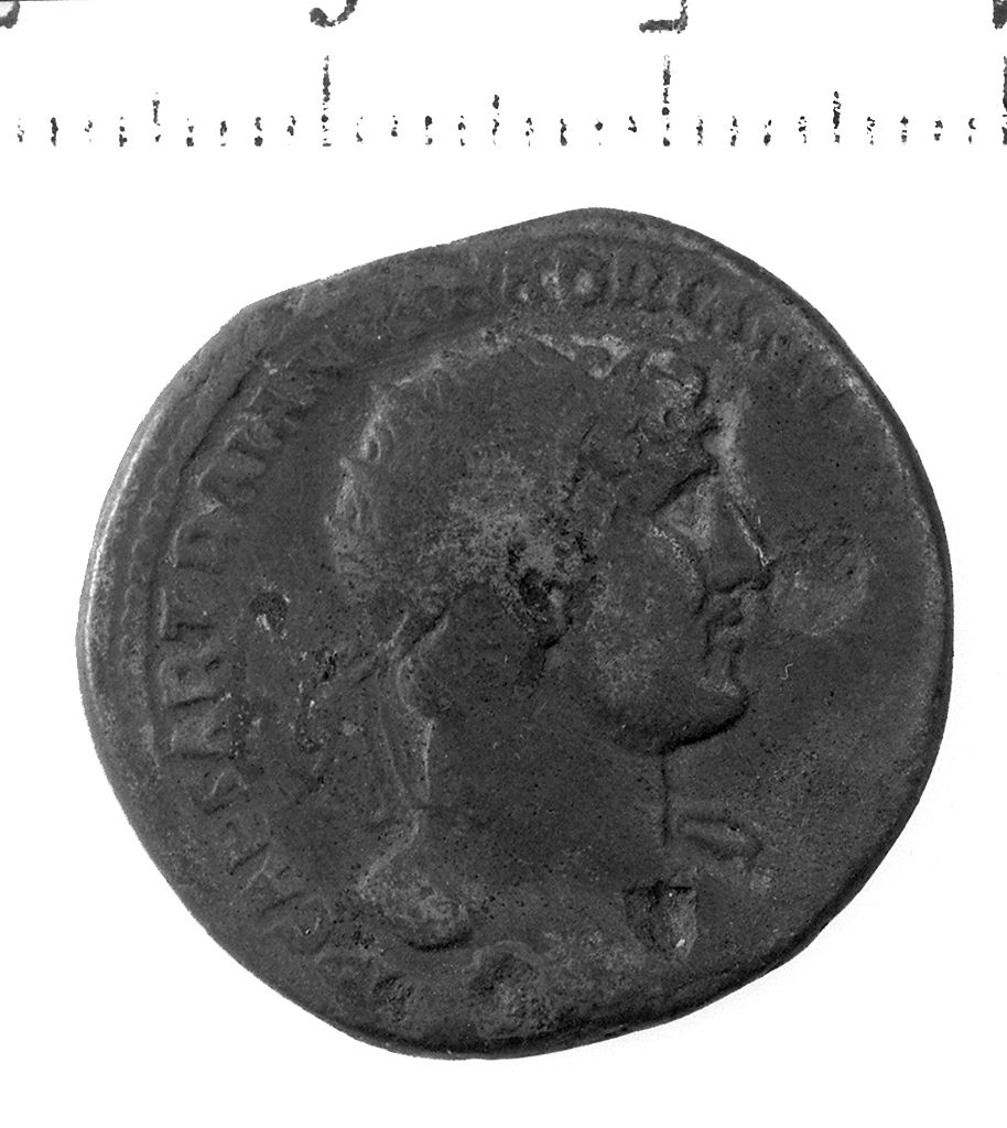 D/ Busto di Adriano radiato a d., con drappeggio sulla spalla s. R/ La Virtus in abito militare stante a s. col piede d. sopra un'elmo, tiene con la mano d. il parazonio e con la s. una lancia rovesciata
