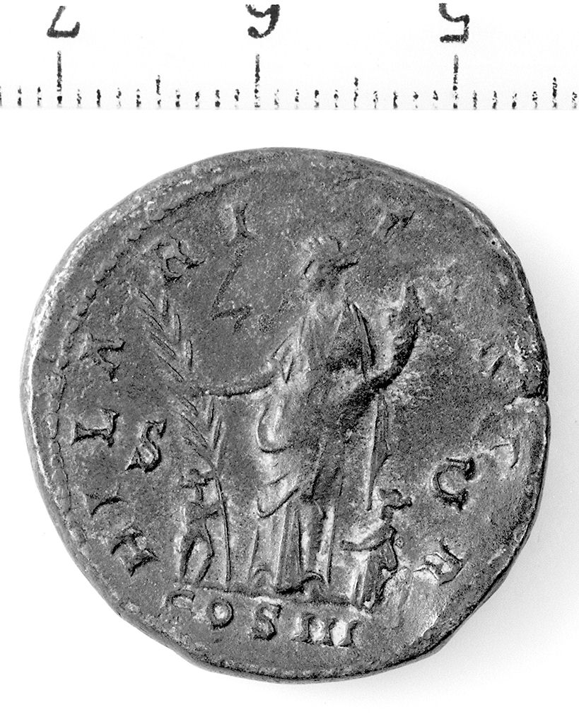D/ Testa di Adriano radiata a d. R/ L'Hilaritas stante di fronte e volta a s., con cornucopia, sorregge un ramo di palma tenuto da un fanciullo, mentre un bambino a d. le porge la mano