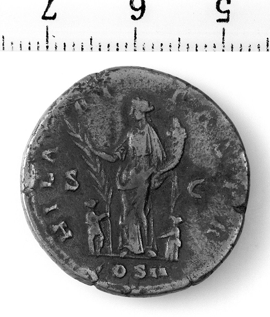 D/ Testa di Adriano radiata a d. R/ L'Hilaritas stante di fronte e volta a s., con cornucopia, sorregge un ramo di palma tenuto da un fanciullo, mentre un bambino a d. le porge la mano