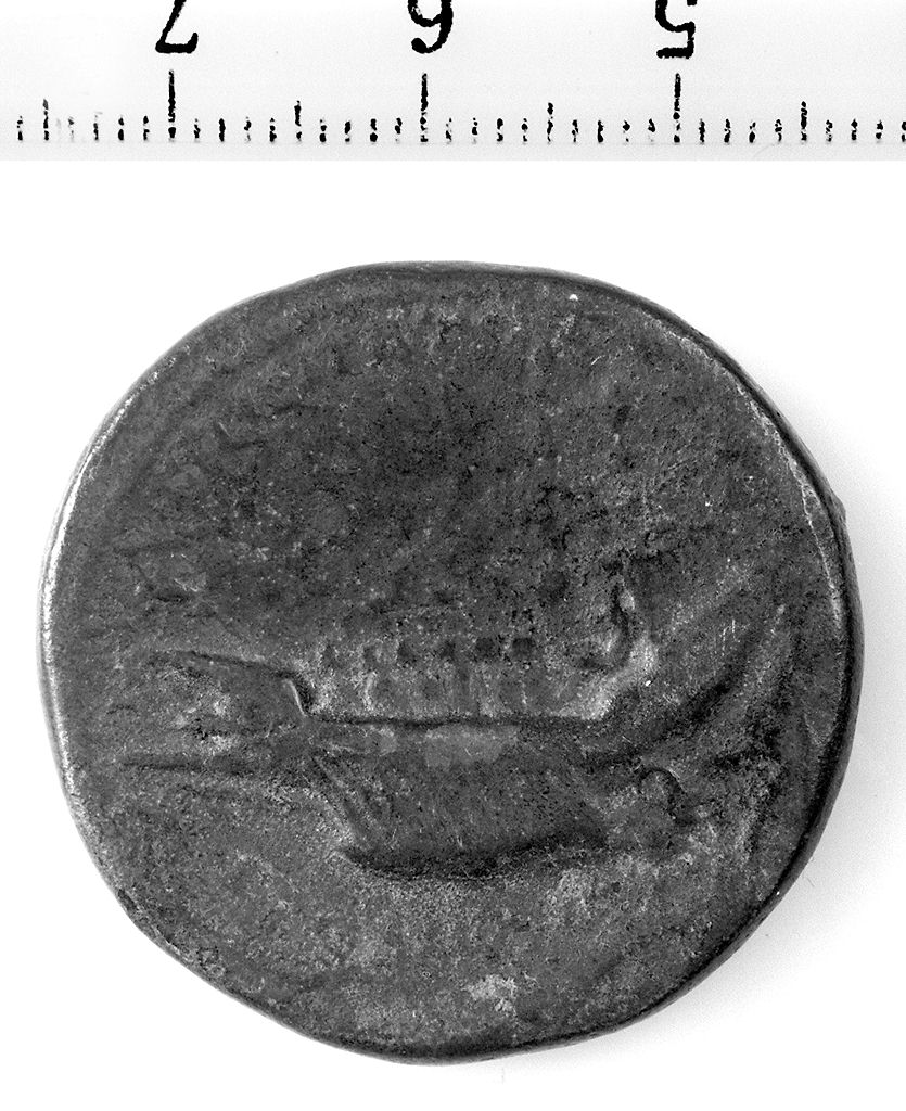 D/ Busto di Adriano a testa nuda a d. R/ Galea navigante a s. con timoniere nel padiglione di poppa e con vessillo ed insegna; albero inclinato verso prua con piccola vela quadra