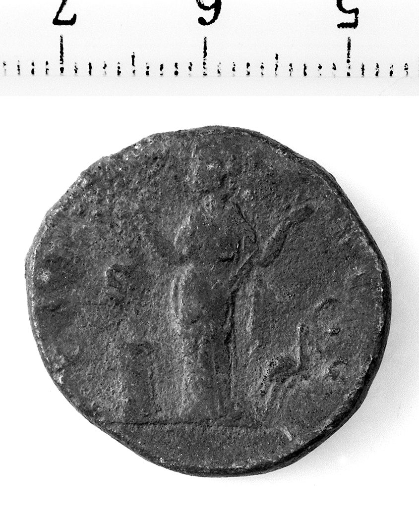 D/ Busto di Adriano laureato e drappeggiato a d. R/ La Pietas stante di fronte e volta a s. con le mani levate; alla sua s. ara, a d. cicogna