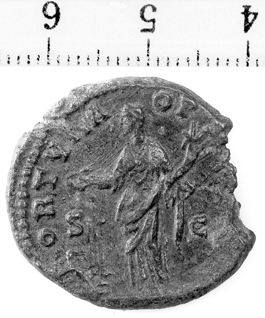 D/ Testa laureata di Antonino Pio volta a d. R/ La Fortuna stante di fronte e volta a s. con patera nella d., la mano s. sul timone poggiante su globo