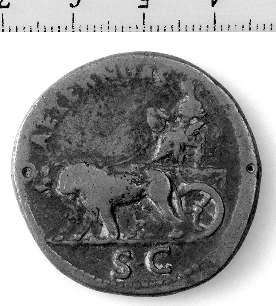 D/ Busto diademato e drappeggiato di Faustina volto a d.; capelli riccamente acconciati con fili di perle. R/ Faustina come Cibele assisa in trono su un carro trainato da due leoni, andante a s