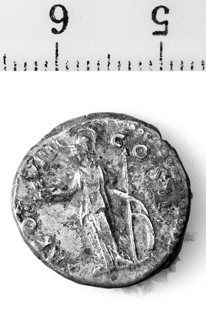 D/ Busto giovanile di M. Aurelio a testa nuda, drappeggiato e volto a d..R/ Minerva elmata stante di fronte e volta a s. con civetta nella d. appoggia la mano s. allo scudo etiene la la lancia appoggiata al braccio s.